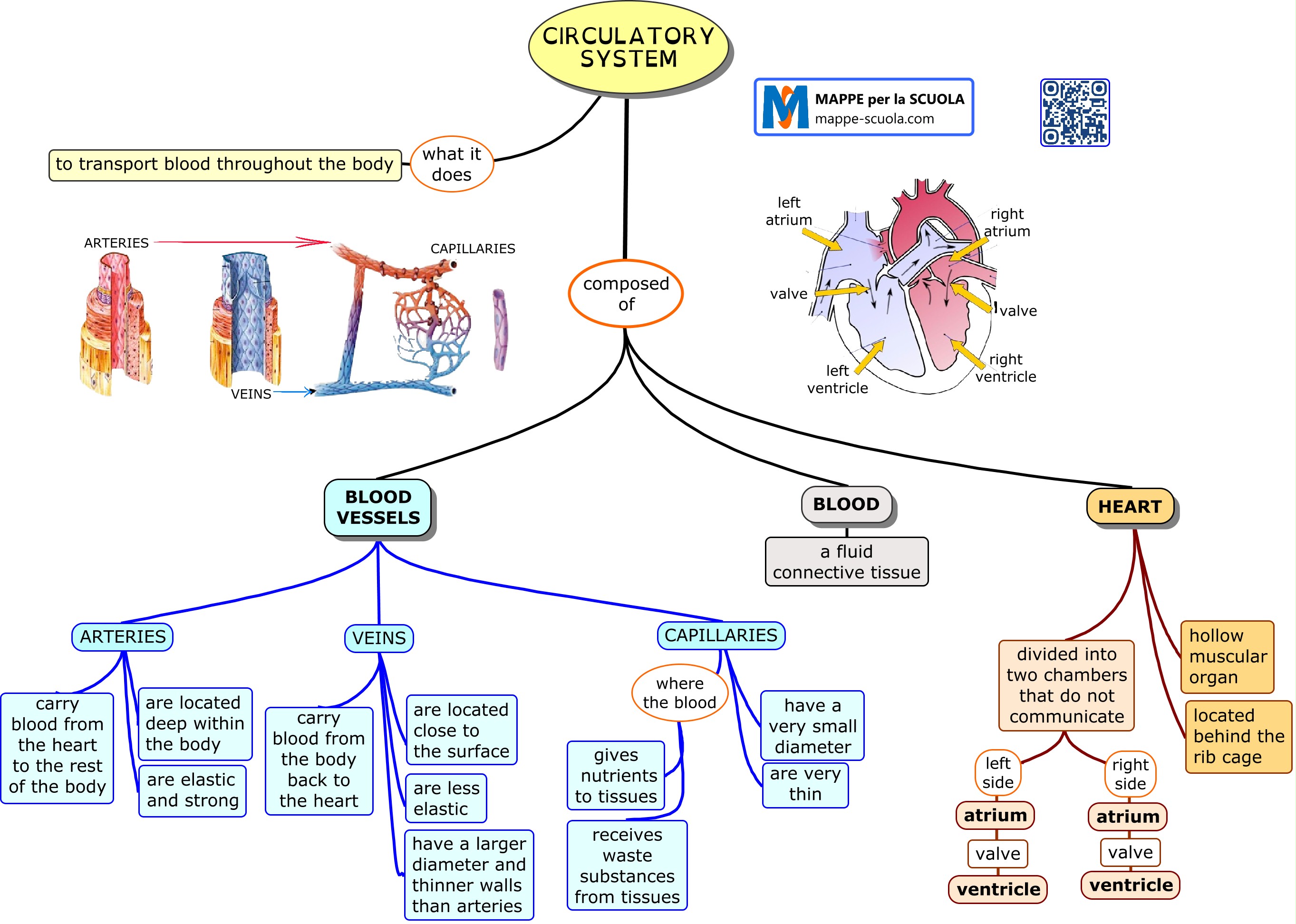 Concept map on the CIRCULATORY SYSTEM. The circulatory system is composed of blood, blood vessels and the heart. The map illustrates the structure and functioning of the circulatory system. It shows how the heart, blood, and blood vessels work together to transport vital substances. Arteries carry blood from the heart to the periphery of the body, while veins bring it back. Capillaries allow the exchange of nutrients and waste between blood and tissues.