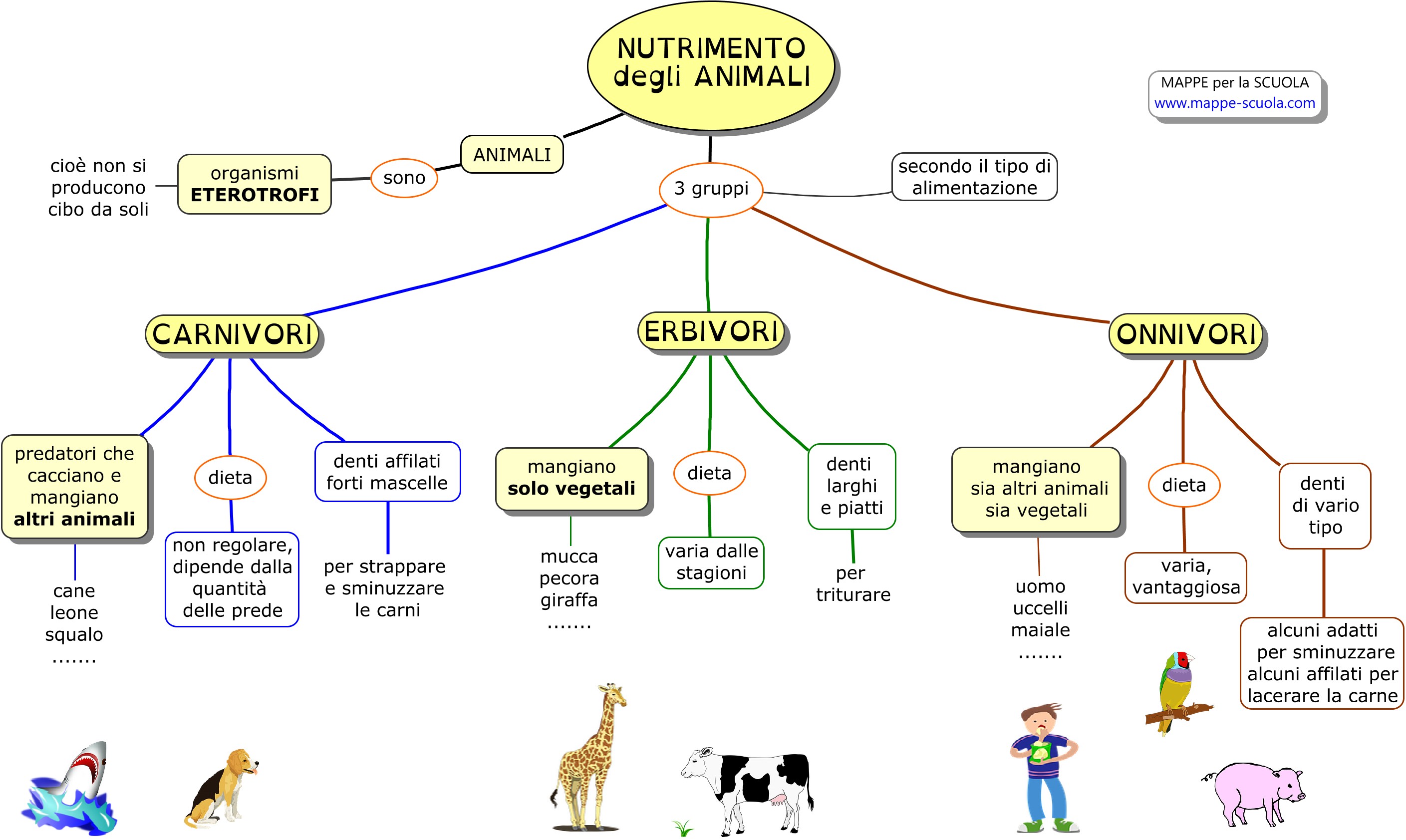 Mappa concettuale sul nutrimento degli animali.Le tre categorie: CARNIVORI, ERBIVORI e ONNIVORI.