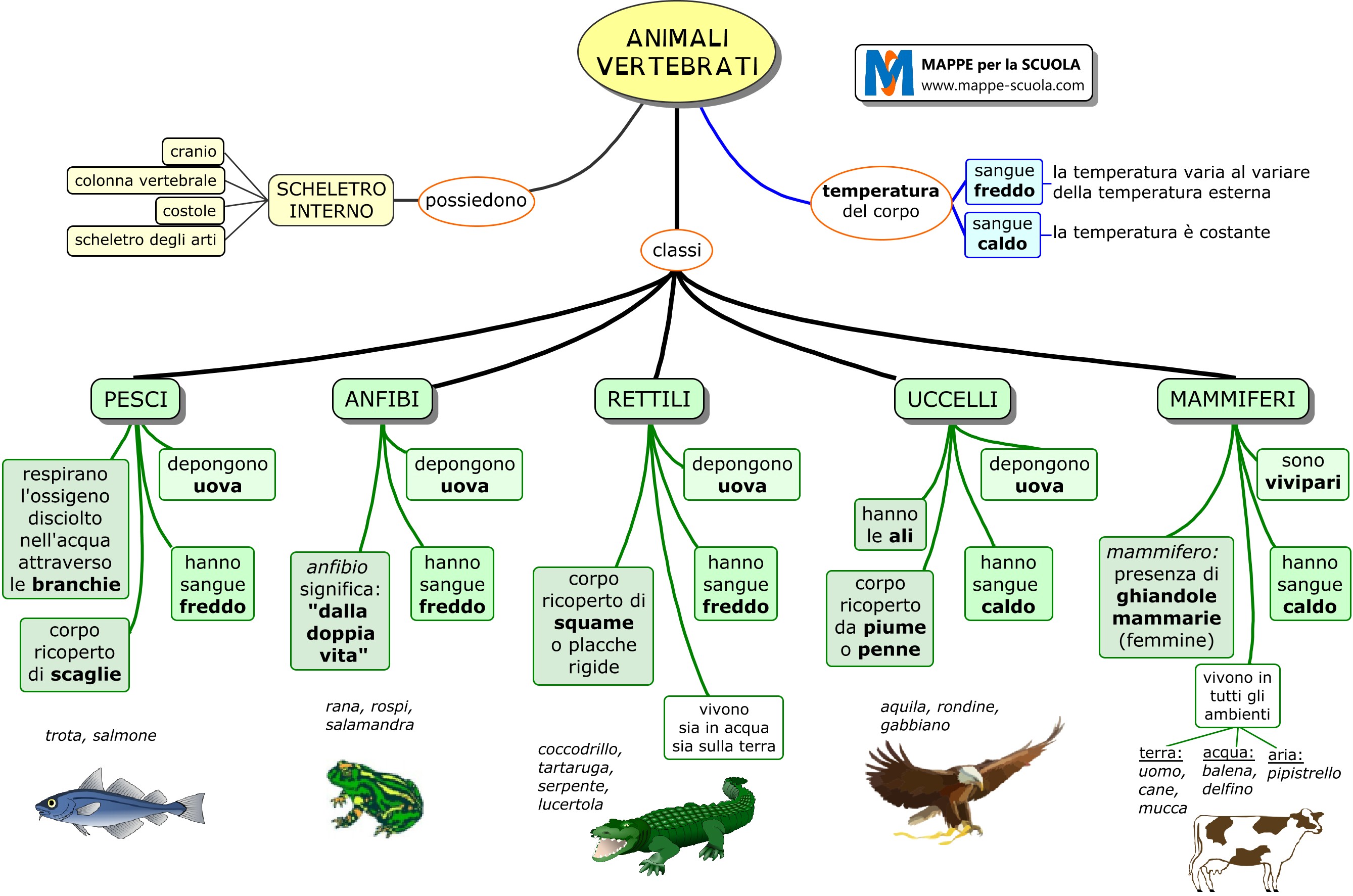 Mappa concettuale sugli animali vertebrati (scienze). I vertebrati sono animali con scheletro interno e colonna vertebrale. Si suddividono in cinque gruppi: pesci, rettili, uccelli, anfibi e mammiferi. Vivono in ambienti molto diversi e hanno adattamenti specifici. La mappa riassume le caratteristiche principali di ciascun gruppo.