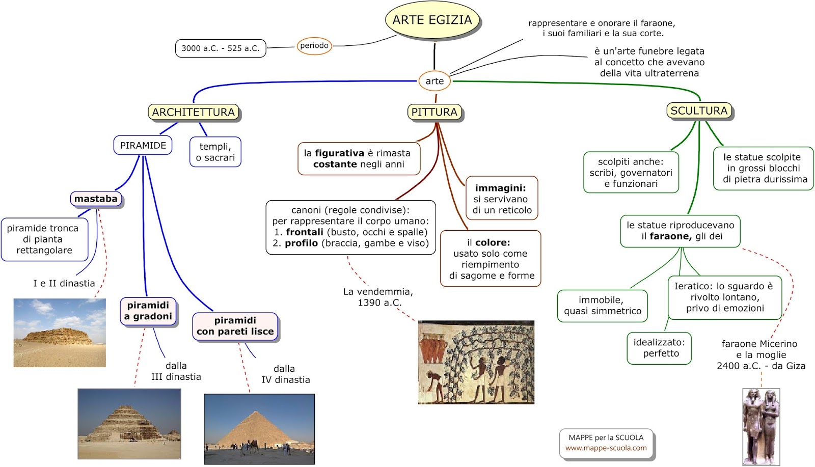 Mappa concettuale sull'ARTE EGIZIA.L'architettura (piramidi, templi o sacrari), la pittura e la scultura (di faraoni e dei) nell'Antico Egitto...