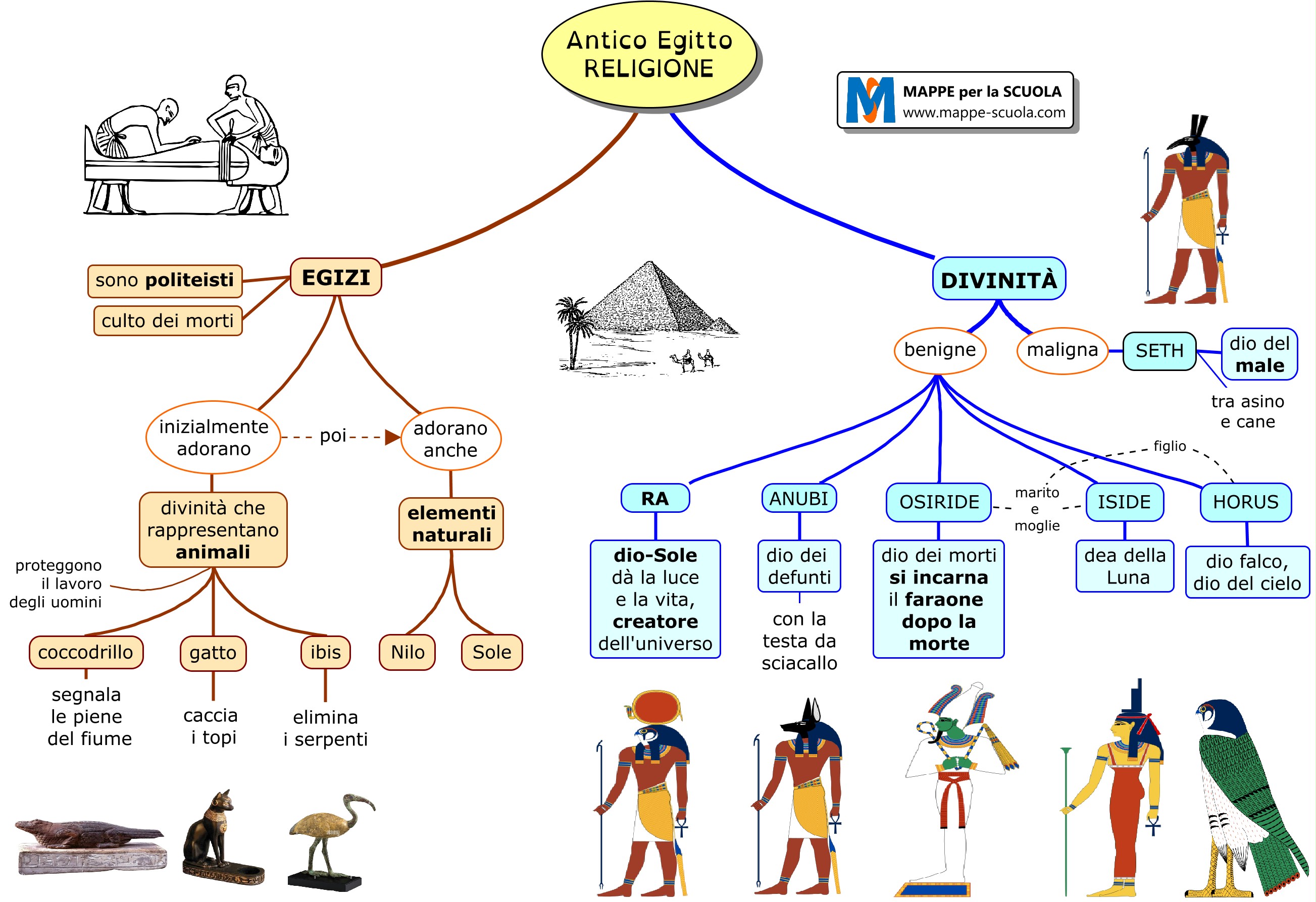 Mappa concettuale sulla RELIGIONE nell'ANTICO EGITTO.Le divinità: Ra, Anubi, Osiride, Iside, Horus e Seth.