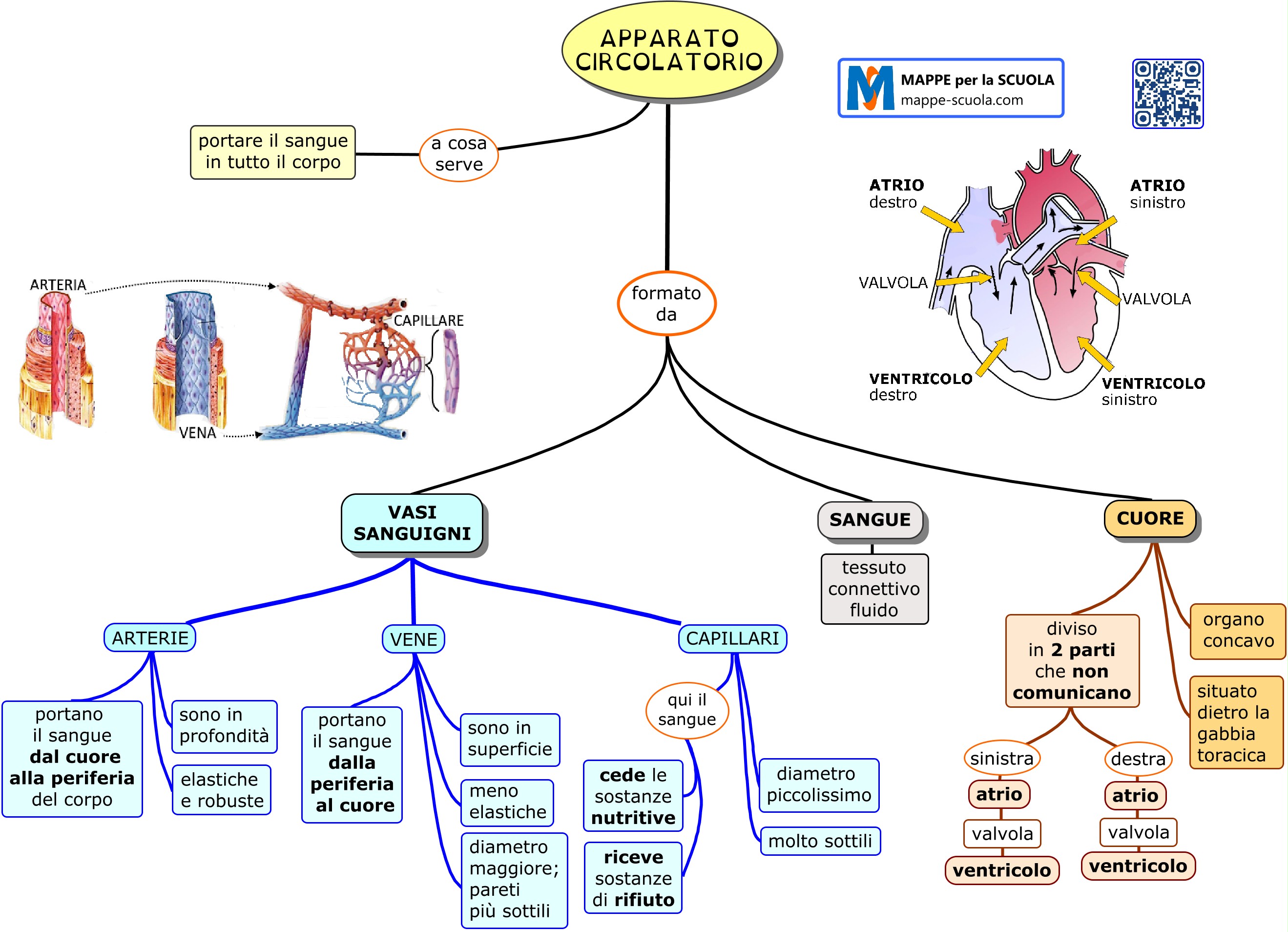 Mappa concettuale sull'APPARATO CIRCOLATORIO. L'apparato circolatorio è composto dal sangue, dai vasi sanguigni e dal cuore. La mappa illustra la struttura e il funzionamento dell’apparato circolatorio. Mostra come il cuore, il sangue e i vasi sanguigni collaborano per trasportare le sostanze vitali. Le arterie portano il sangue dal cuore alla periferia del corpo, mentre le vene lo riportano indietro. I capillari permettono lo scambio di nutrienti e rifiuti tra sangue e tessuti.