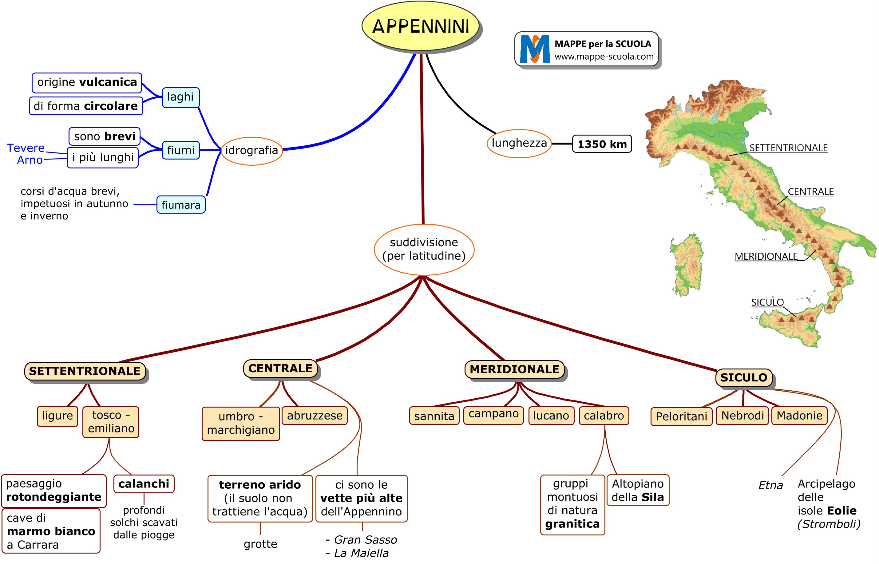 Gli Appennini suddivisi in: Appennino settentrionale (ligure, tosco-emiliano), Appennino centrale (umbro-marchigiano, abruzzese), Appennino meridionale (sannita, campano, lucano, calabro) e siculo (monti Peloritani, Nebrodi e Madonie).