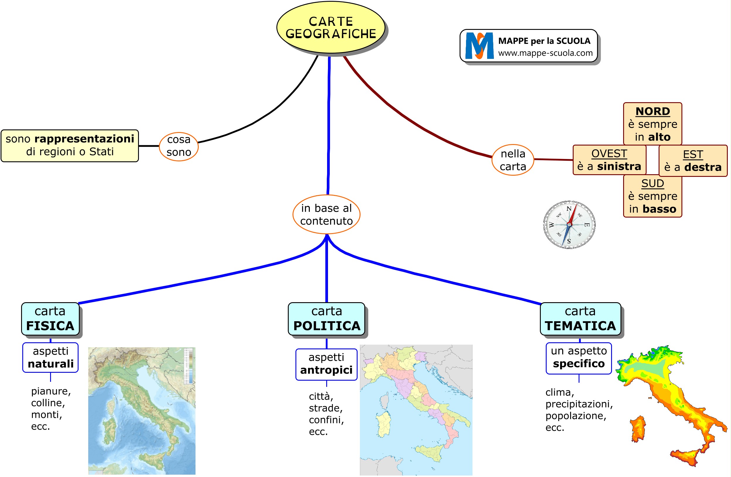 Mappa concettuale sulle CARTE GEOGRAFICHE (geografia).In base al contenuto, le carte geografiche si dividono in: carte fisiche, carte politiche, carte tematiche.