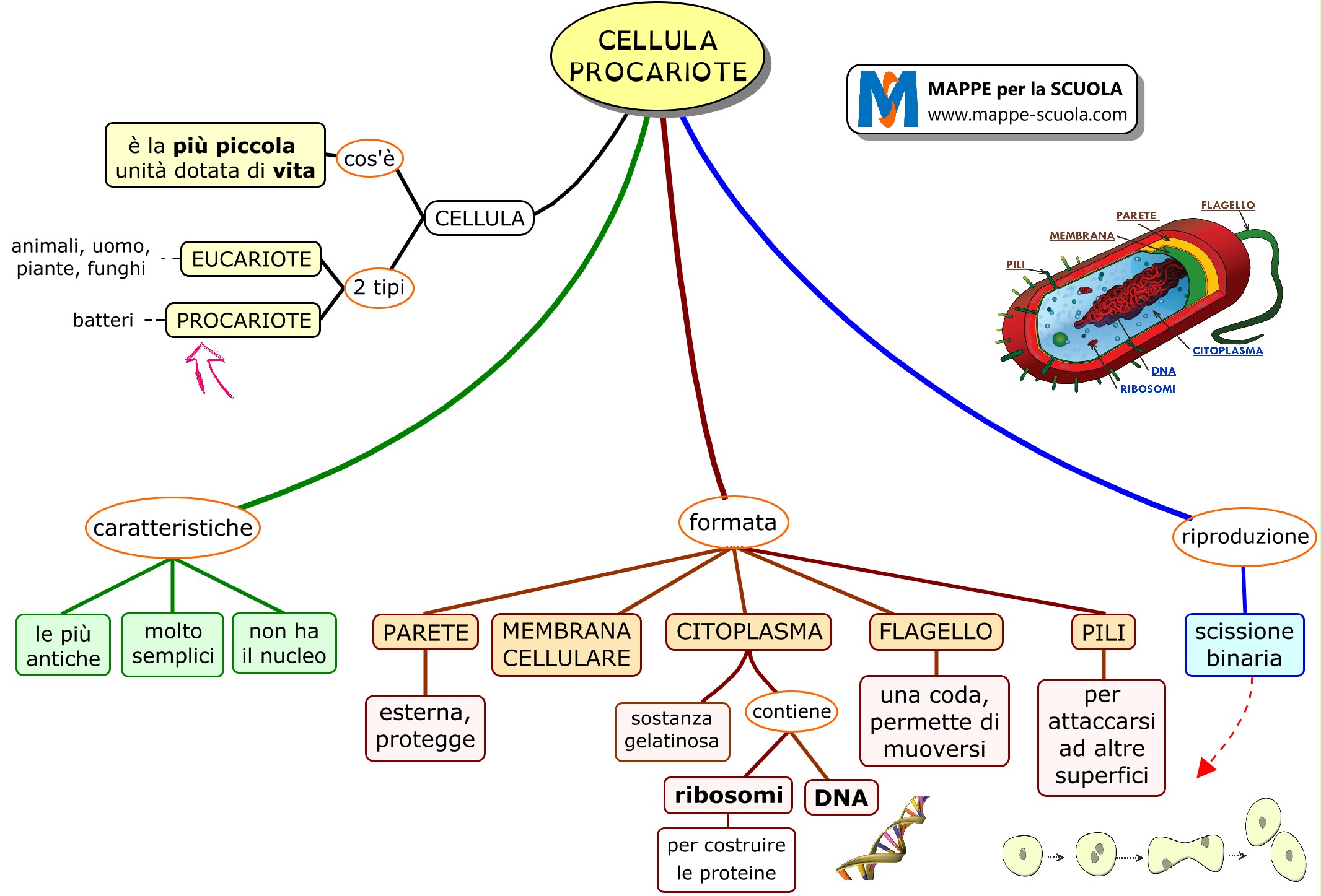 Mappa concettuale sulla cellula procariote (scienze). Esistono due tipi di cellule: eucariote e procariote. Nello schema qui sotto sono indicate le caratteristiche della cellula procariota (batteri, alghe azzurre).