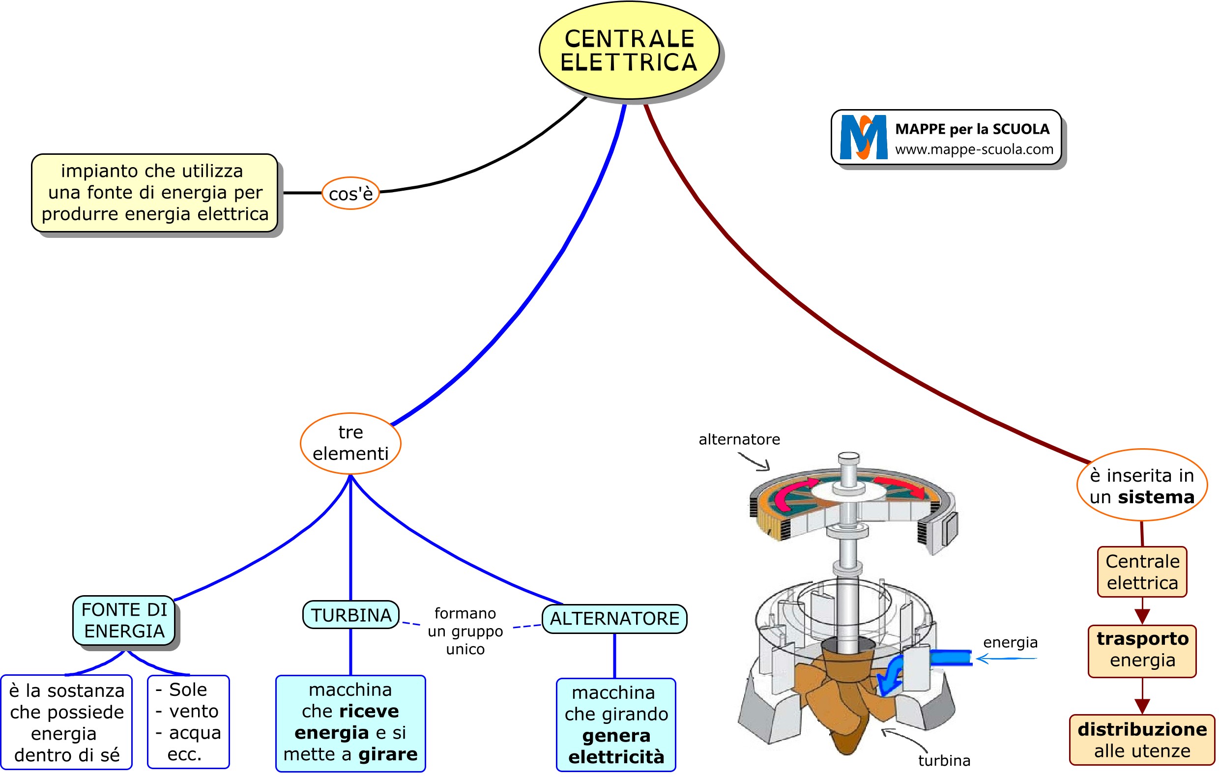 Mappa concettuale sulla CENTRALE ELETTRICA (Tencologia, per le Medie).La Centrale elettrica: i tre elementi più importanti: la Fonte di Energia, la Turbina e l'Alternatore.