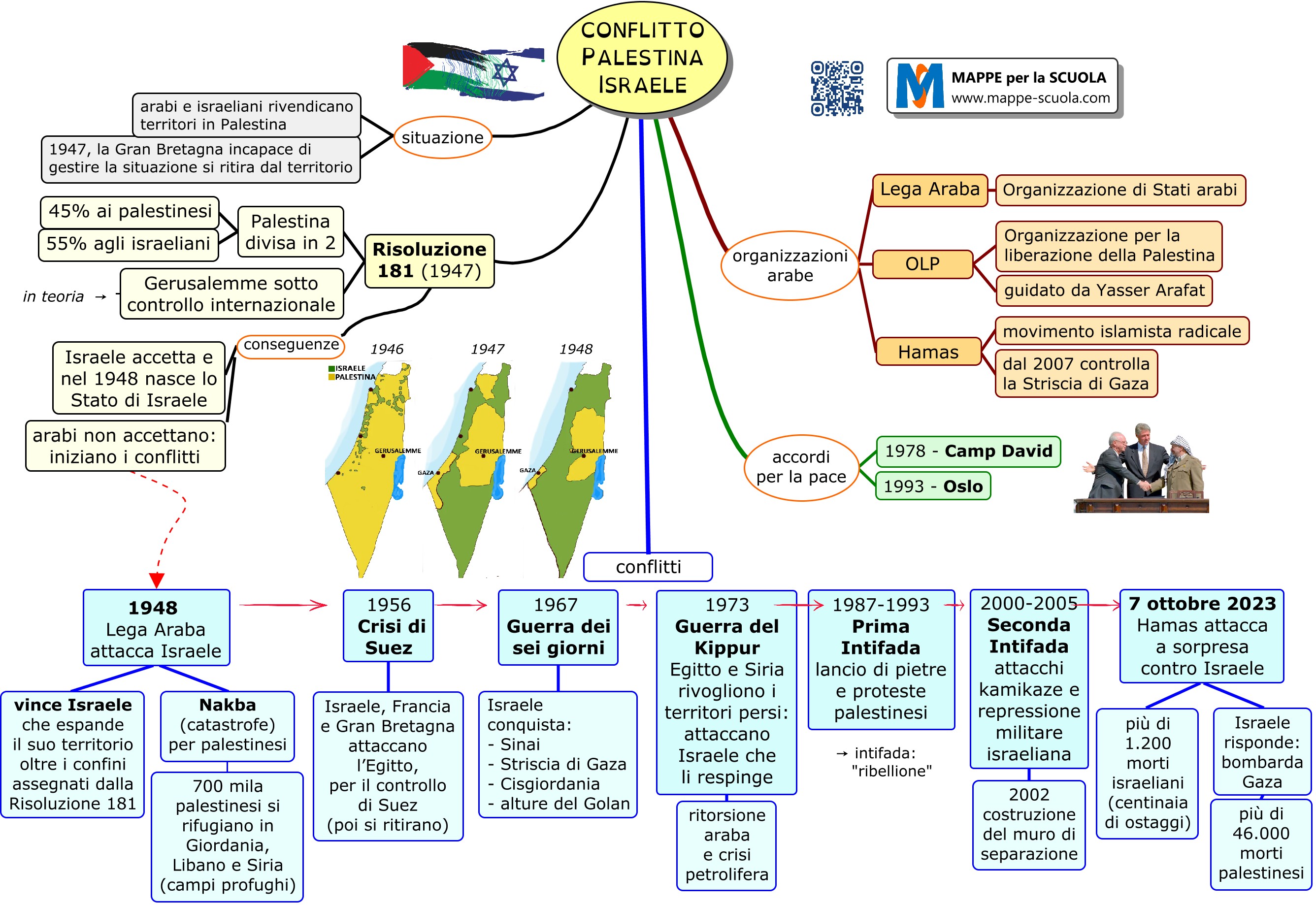 Mappa concettuale sul conflitto tra Palestina e Israele (scuola secondaria). La mappa concettuale illustra l'evoluzione del conflitto israelo-palestinese dal 1947 al 2023, evidenziando eventi chiave. Si parte dalla Risoluzione ONU 181 (1947), che propose la divisione della Palestina in due stati, seguita dalla guerra arabo-israeliana del 1948. Si analizzano poi la crisi di Suez (1956) e la Guerra dei Sei Giorni (1967), con l'occupazione di Gaza, Cisgiordania e Gerusalemme Est. Sono inclusi eventi come la Prima Intifada (1987-1993) la Seconda Intifada (2000-2005) e gli Accordi di Oslo (1993), che tentarono di avviare un processo di pace. Infine, si considerano le tensioni e i conflitti successivi fino al 2023.