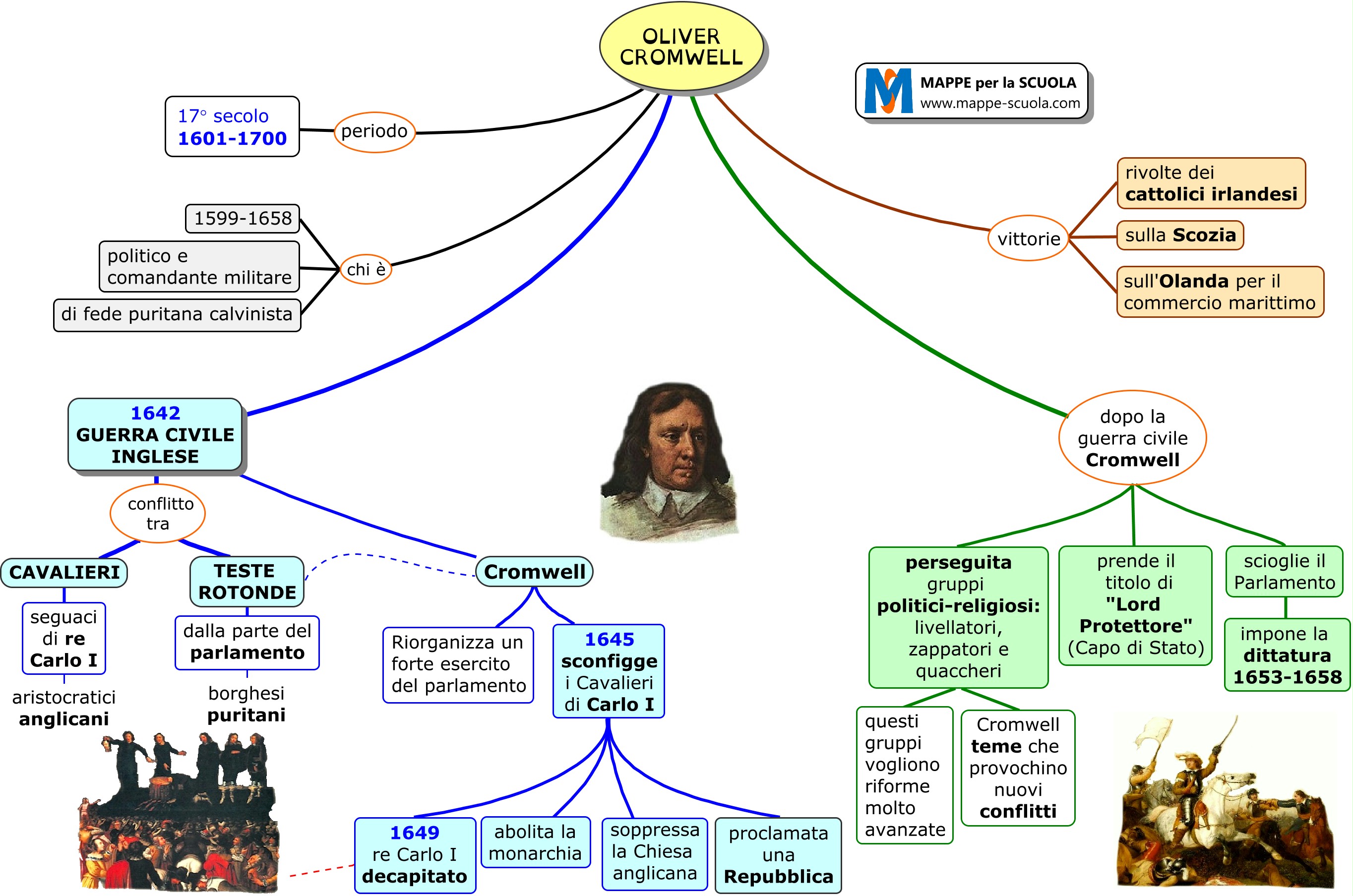 Mappa concettuale su CROMWELL e la GUERRA CIVILE INGLESE. Nella mappa una sintesi degli eventi. Cromwell è un puritano e combatte contro i Cavalieri (anglicani) seguaci di re Carlo I. Cromwell sconfigge i Cavalieri e proclama la Repubblica, diventa poi Lord Protettore...