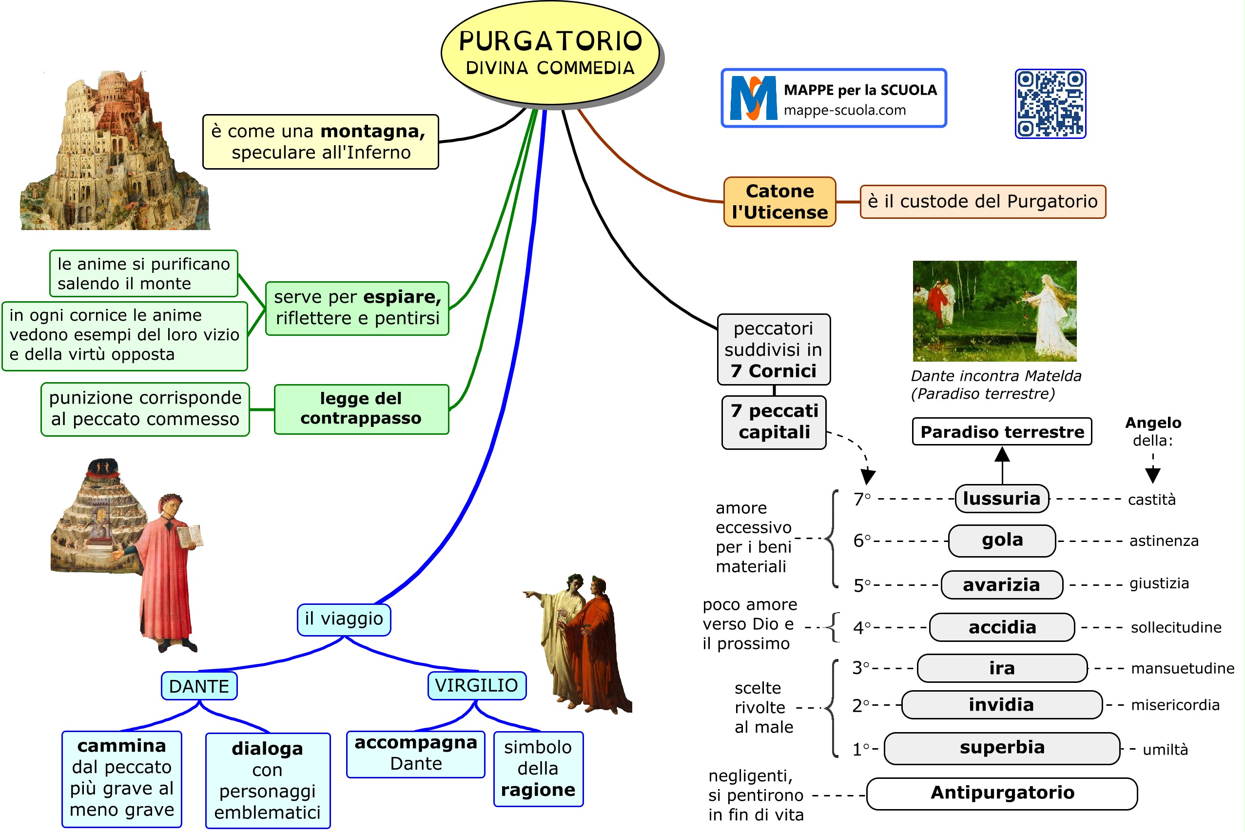 Mappa concettuale sul Purgatorio della DIVINA COMMEDIA. In questa mappa una sintesi del Purgatorio di Dante Alighieri. Dante e Virgilio, Catone, i Sette peccati capitali, la legge del contrappasso...