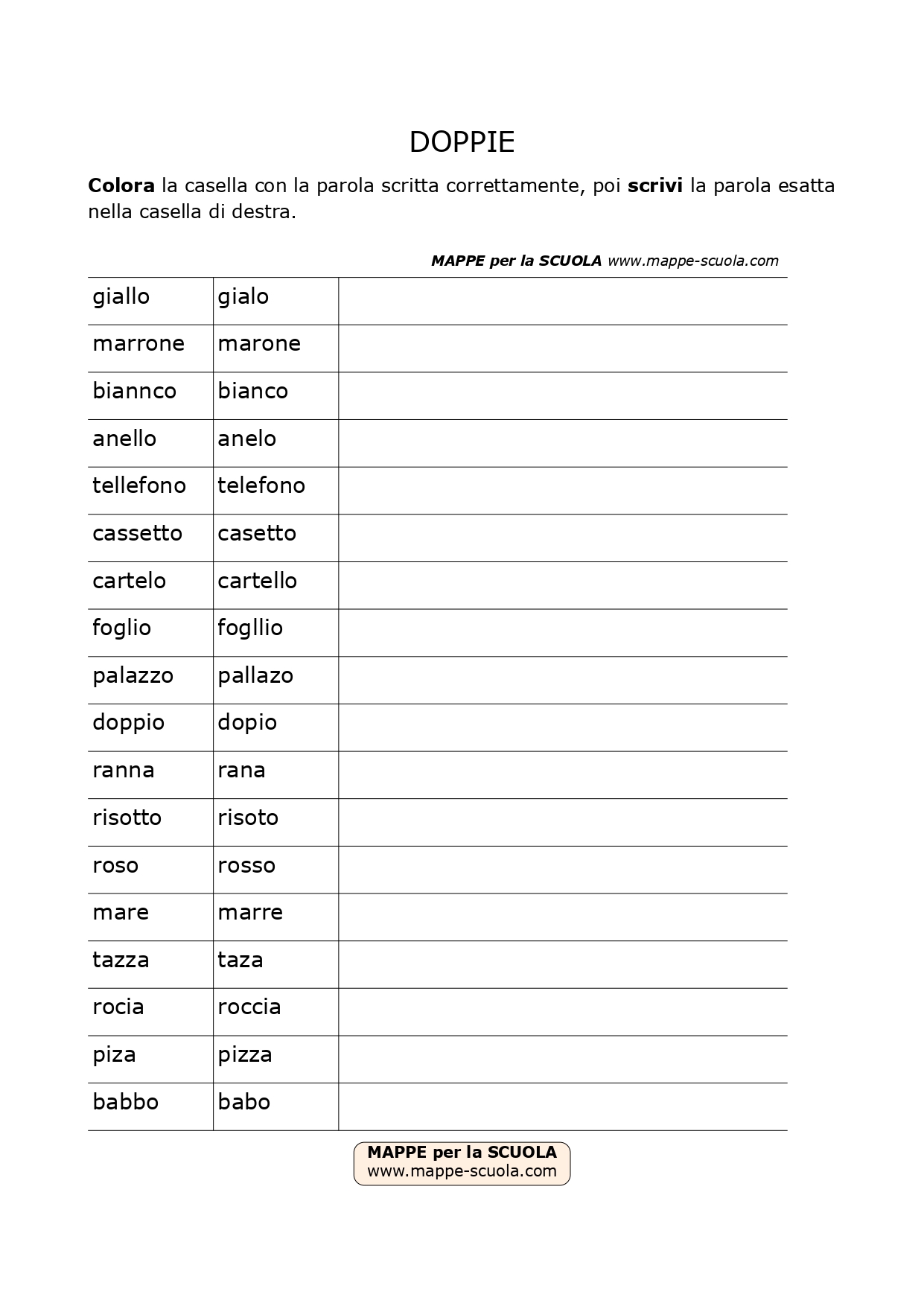 Scheda come esercizio sull'uso delle lettere doppie. Far colorare la casella corretta e far riscrivere la parola esatta.