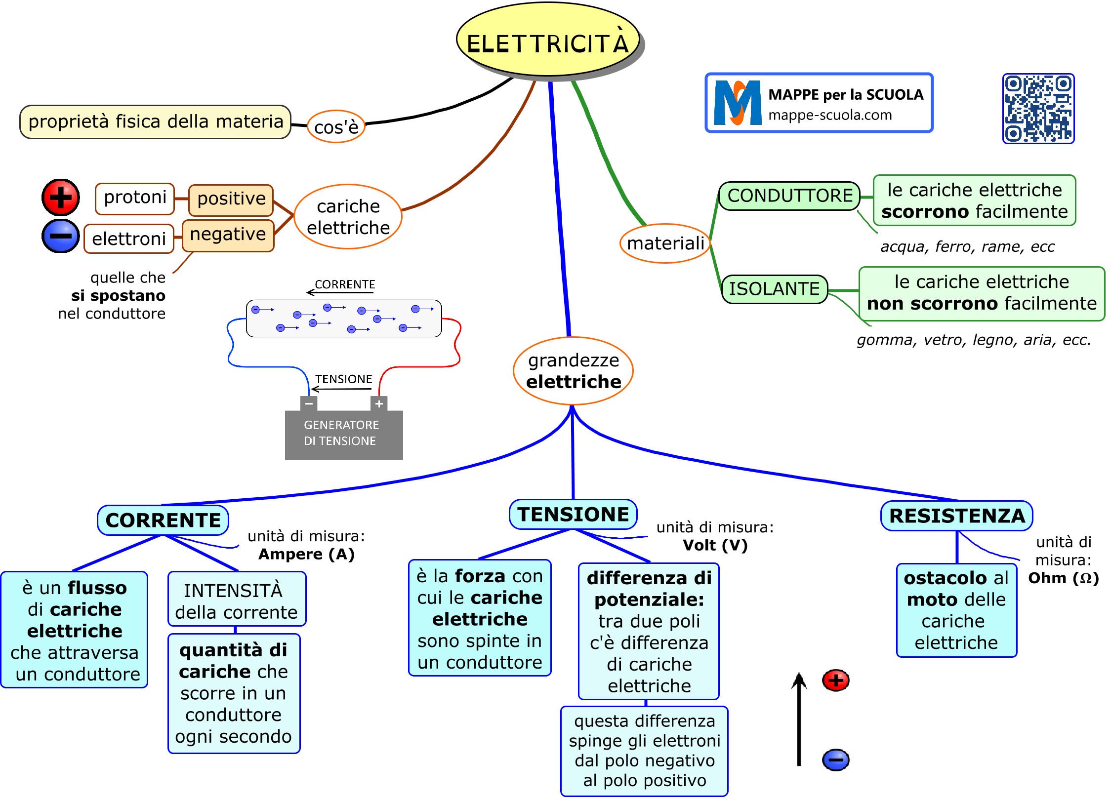 Mappa concettuale sull’Elettricità (scienze, tecnologia). L’elettricità è una proprietà fisica della materia legata alle cariche elettriche positive e negative. Le grandezze principali sono corrente, tensione e resistenza, ognuna con la propria unità di misura. I materiali si distinguono in conduttori, che lasciano passare facilmente le cariche, e isolanti, che le ostacolano. L'elettricità è alla base di molti fenomeni e applicazioni tecnologiche della vita quotidiana.