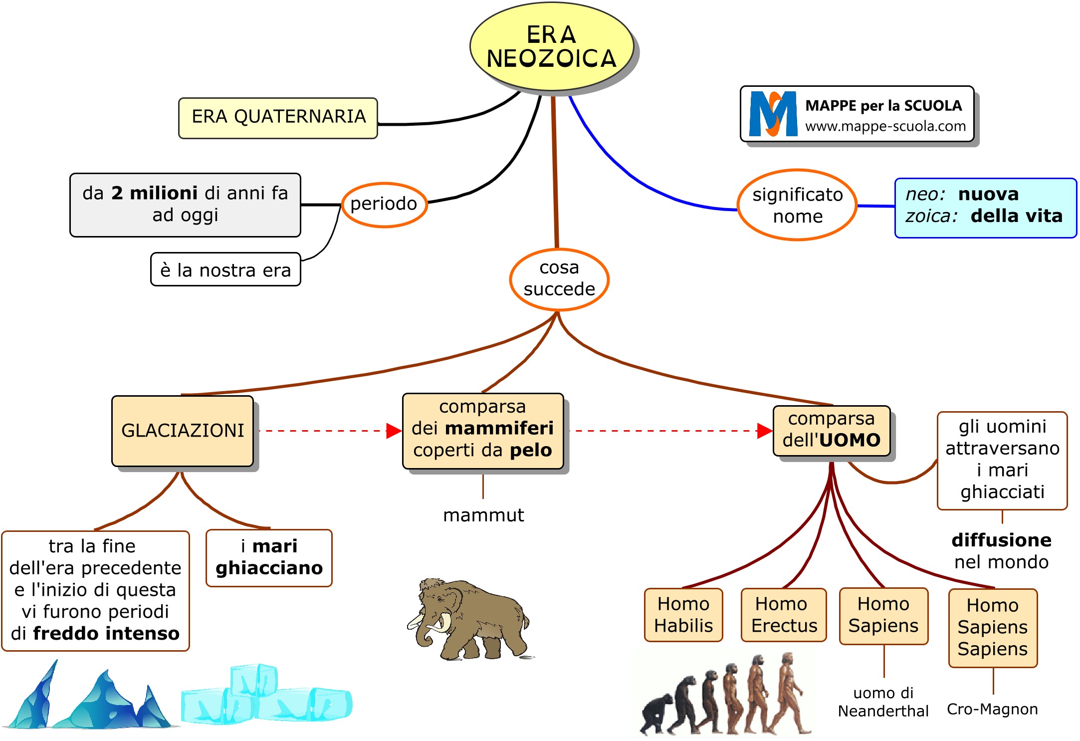 Mappa concettuale sull'ERA NEOZOICA (QUATERNARIA) - storia, primariaL'era Neozoica è la quinta e ultima delle 5 ERE GEOLOGICHE.