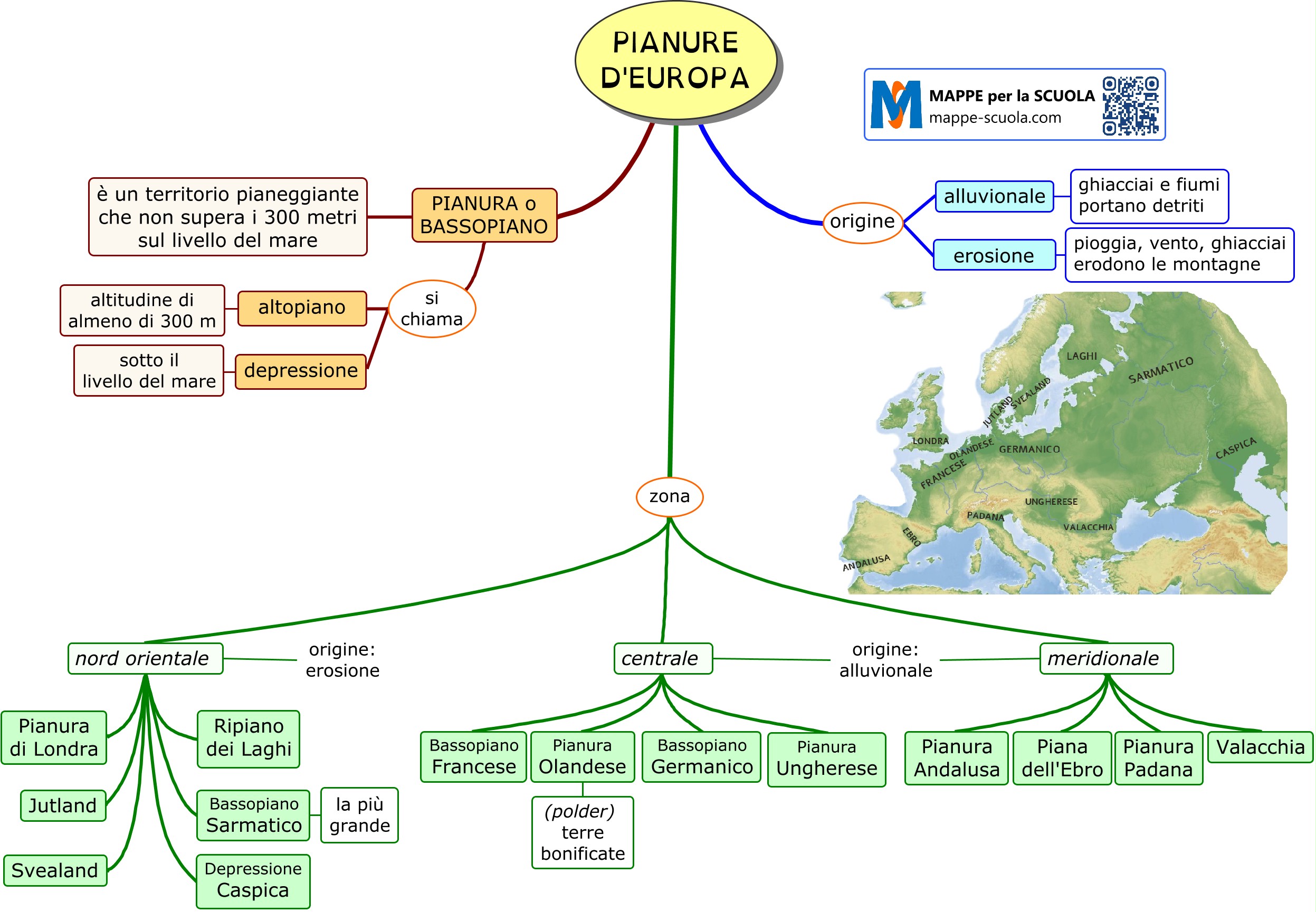 Mappa concettuale sulle pianure in Europa (scuola secondaria, geografia). Questa mappa concettuale offre uno schema sintetico delle principali pianure dell’Europa. Attraverso collegamenti logici e visivi, la mappa permette di esplorare i territori pianeggianti più estesi del continente, facilitando lo studio della geografia fisica dell’Europa.