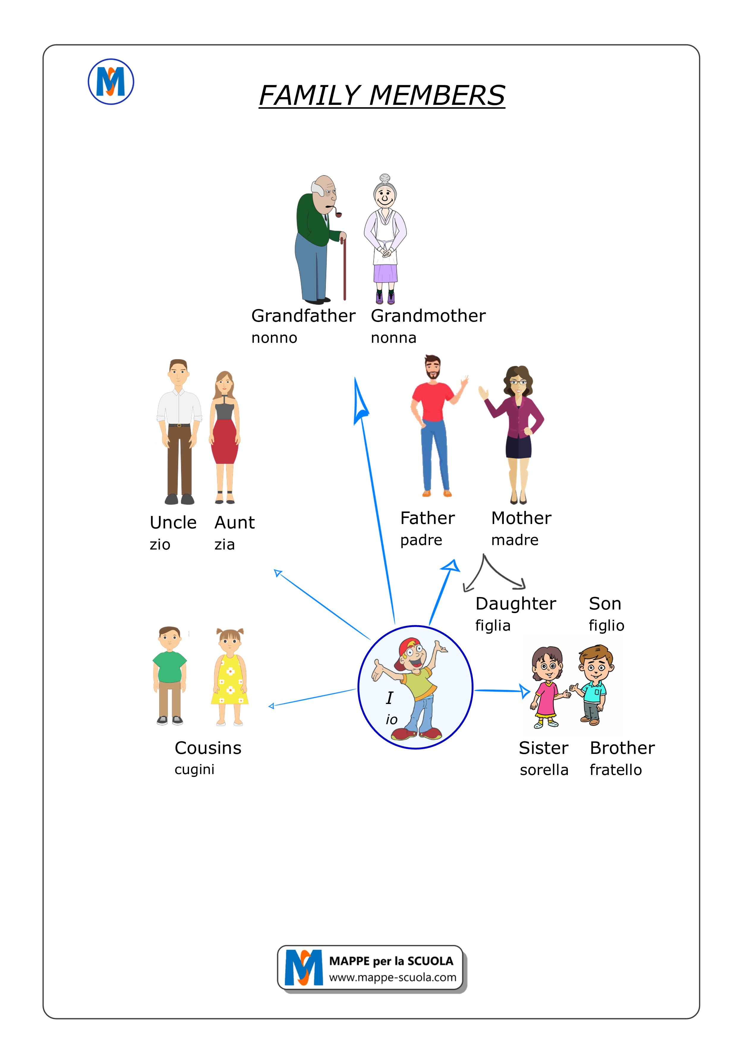 FAMILY MEMBERS – Scheda con i nomi dei componenti di una famiglia (inglese). Qui sotto la scheda con il nome in inglese del componente della famiglia, la traduzione e un'immagine associata per facilitare l'apprendimento.