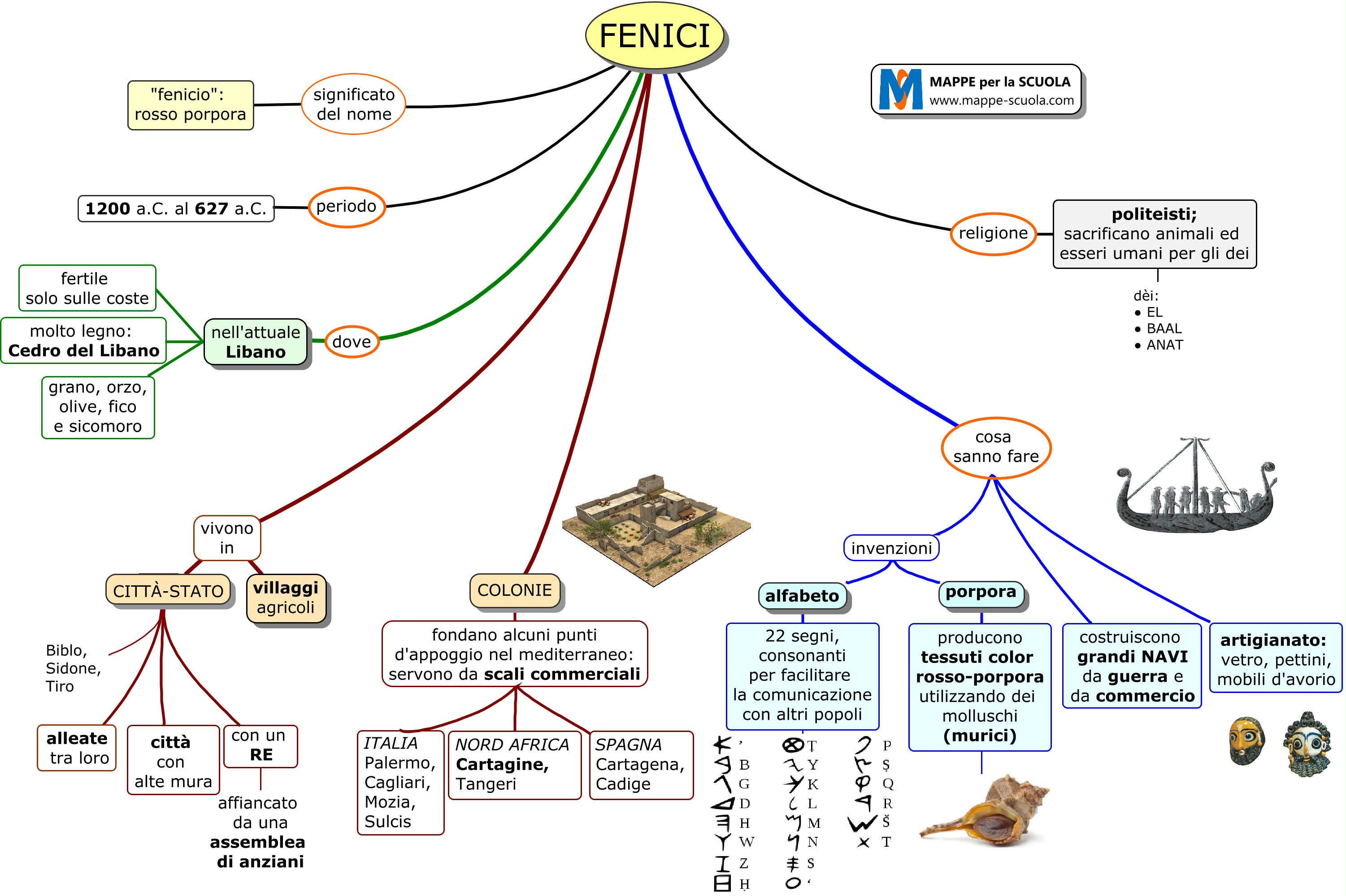 Mappa concettuale sui FENICI: le Città-Stato, le attività, le colonie, l'alfabeto, la porpora ecc.