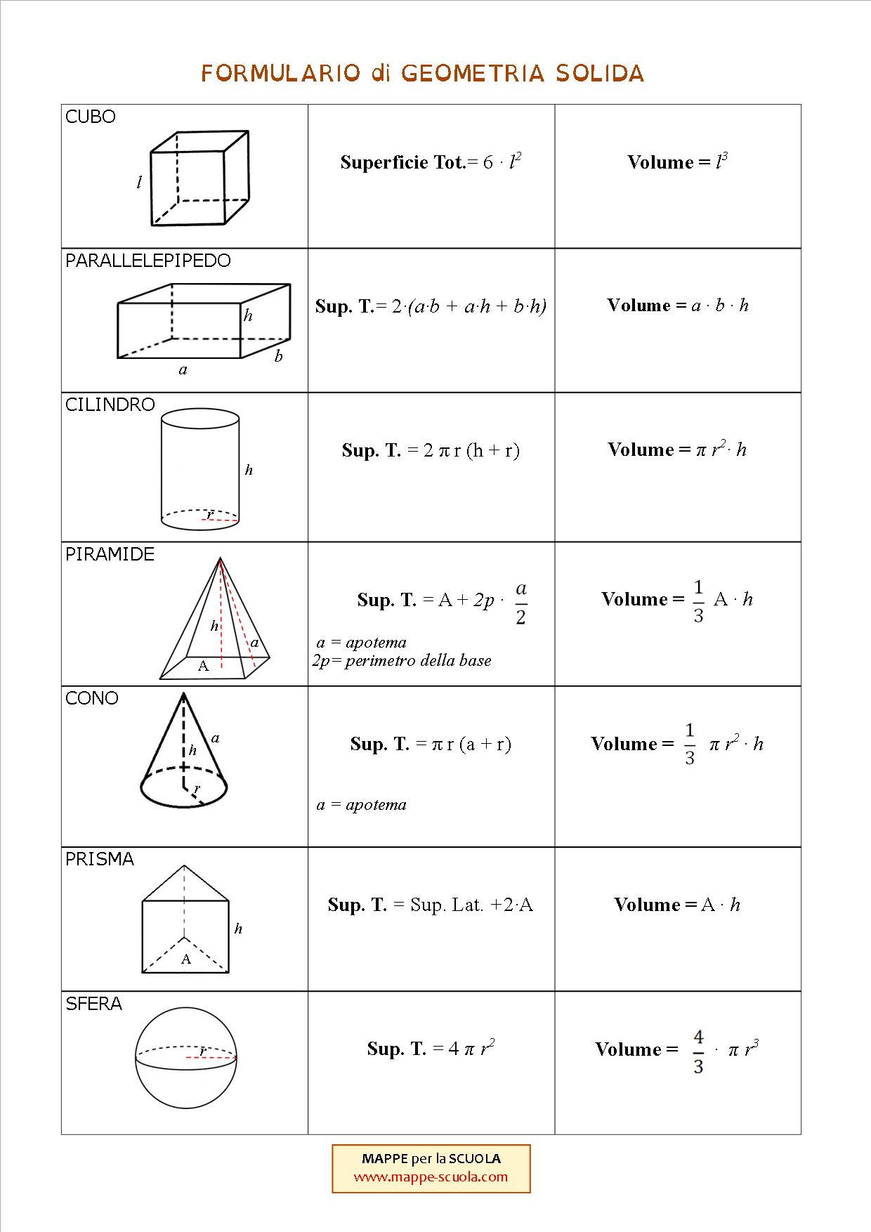 FORMULARIO DI GEOMETRIA SOLIDACubo, parallelepipedo, cilindro, piramide, cono, prisma e sfera. Le formule per calcolare il Volume e la Superficie totale.