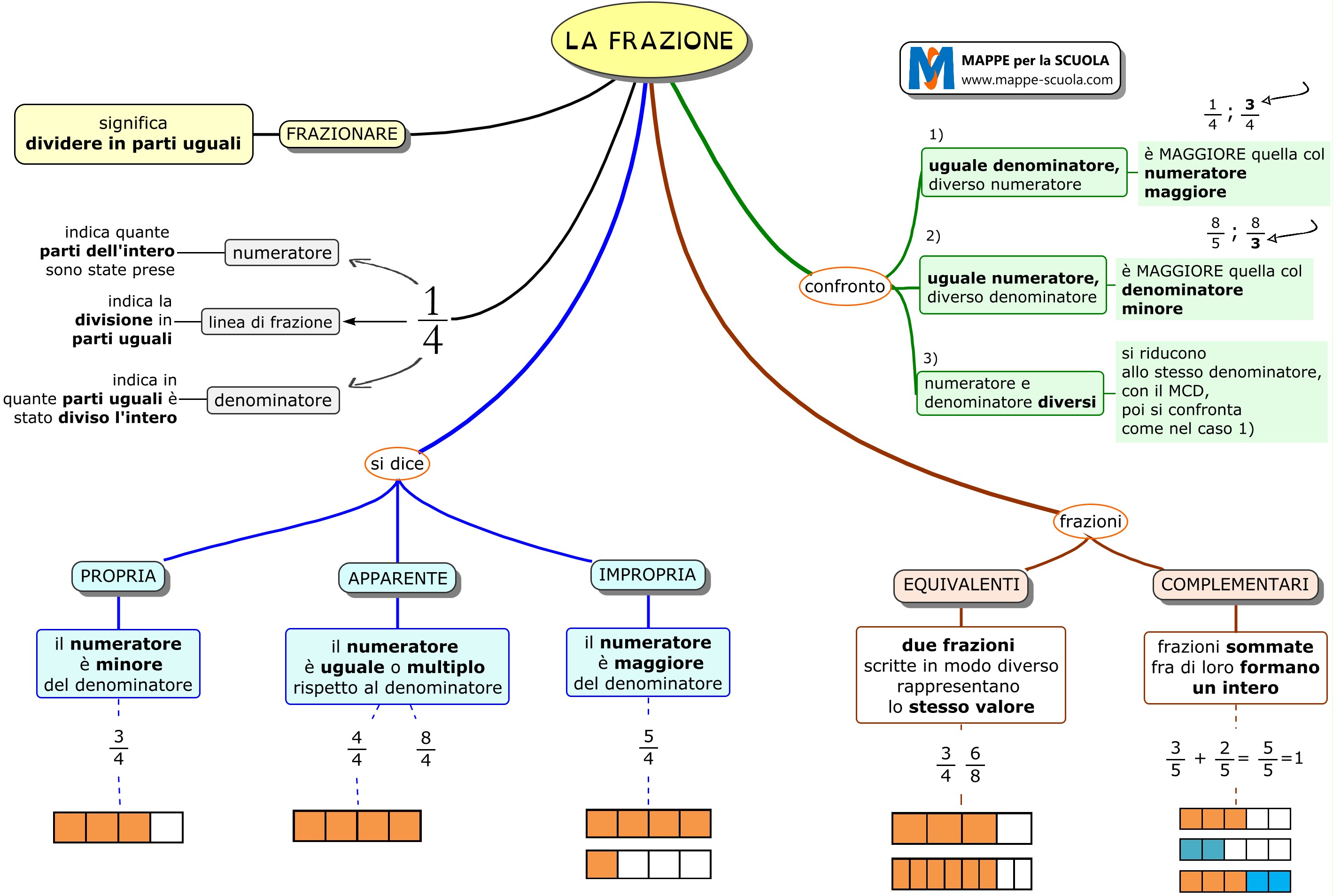 Mappa concettuale sulle FRAZIONI. Frazionare significa dividere in parti uguali. Nella mappa sono descritte le frazioni proprie, improprie ed apparenti; le frazioni equivalenti e complementari; il confronto tra frazioni...