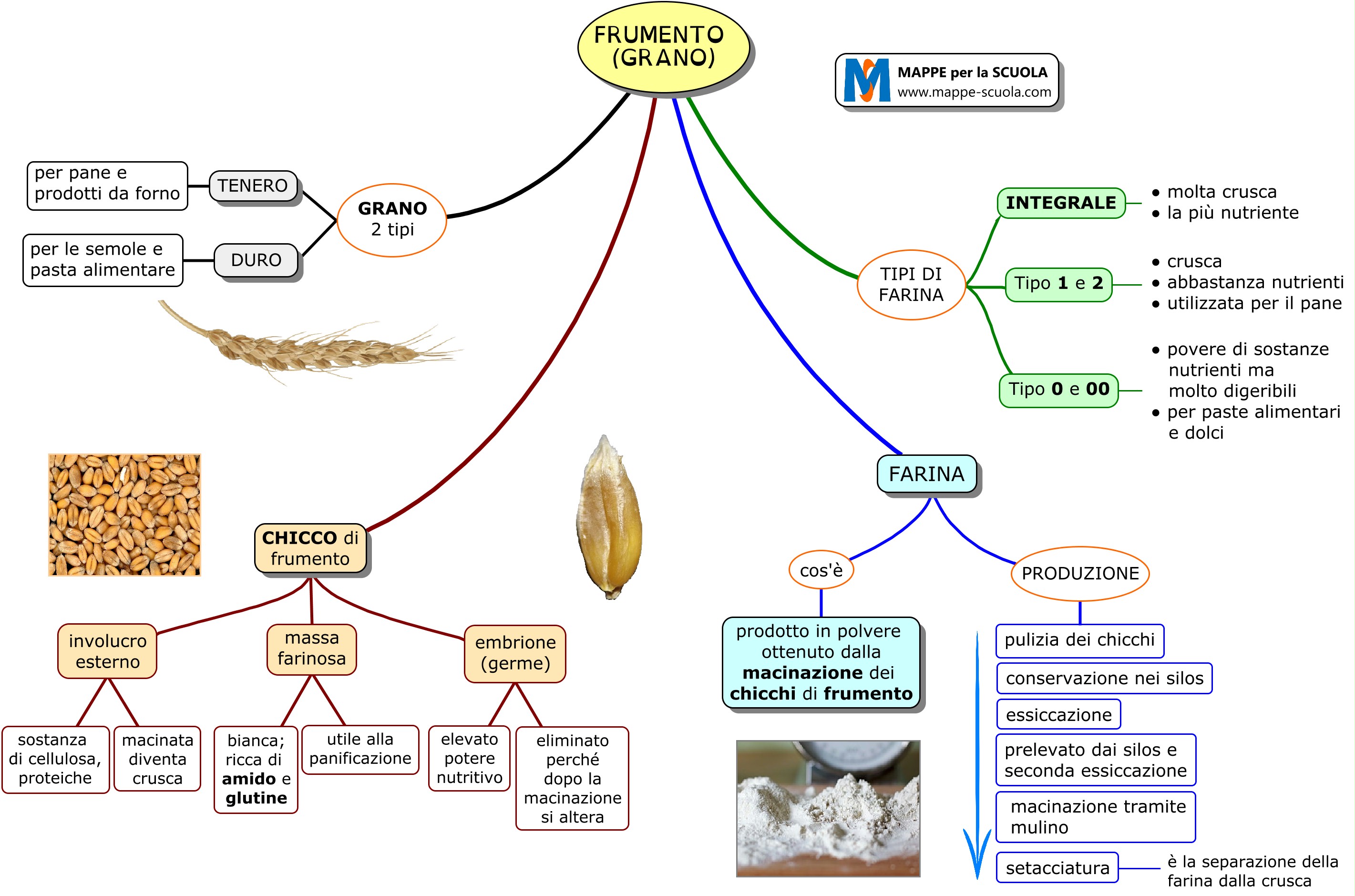 Nella mappa si descrive inoltre: il chicco di frumento, cos'è la farina, le fasi di produzioni e i tipi di farina.