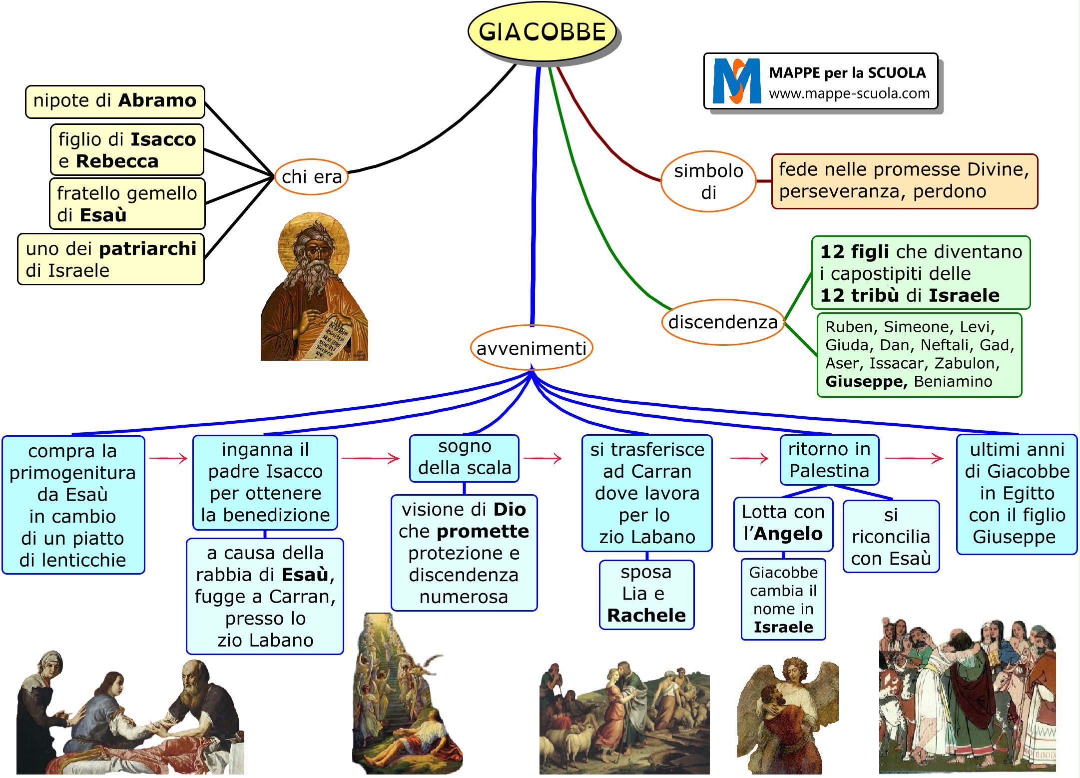 Mappa concettuale sulla figura di Giacobbe, patriarca d'Israele, nipote di Abramo I principali eventi della vita di Giacobbe e il significato della sua eredità spirituale. Giacobbe e la lotta con l'angelo, il sogno della scala, il cambio del nome in Israele, che simbolizzano la sua crescita spirituale e il rapporto con Dio. La mappa evidenzia inoltre i suoi legami familiari, l’importanza dei suoi dodici figli e la discendenza dalle dodici tribù di Israele.