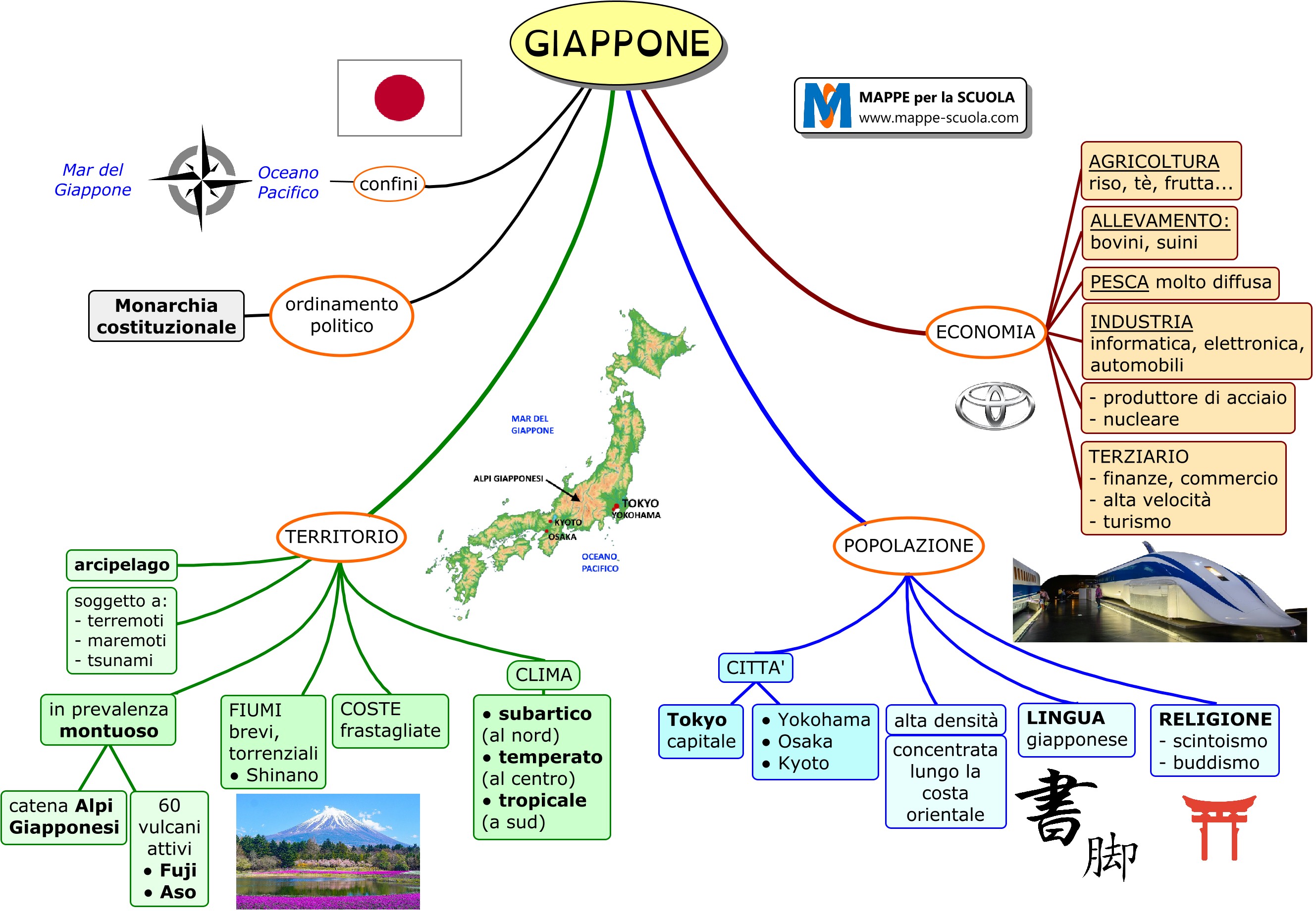 Mappa concettuale sul GIAPPONE (geografia). Il Giappone è un arcipelago dell'Asia orientale. Il territorio del Giappone è prevalentemente montuoso (Monte Fuji, la vetta più alta). Circondato dall'Oceano Pacifico, il Mar del Giappone e il Mar Cinese Orientale, il Giappone è soggetto a frequenti terremoti e attività vulcanica. Il clima varia da quello temperato a nord a subtropicale a sud, offrendo una grande biodiversità e paesaggi naturali unici.