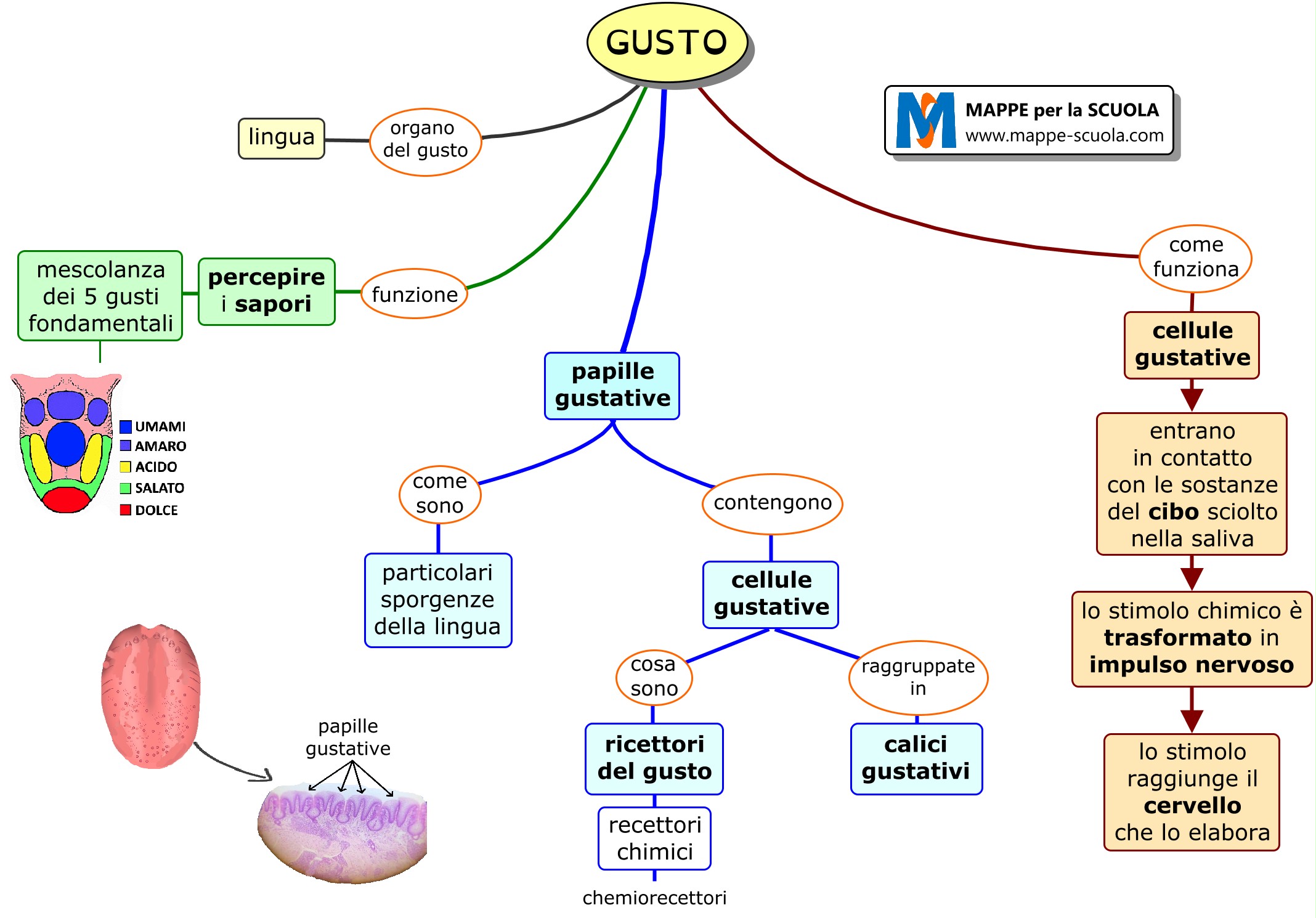 Mappa concettuale sul GUSTO (scienze - corpo umano).Il gusto è uno dei cinque sensi di cui è dotato l'essere umano.L'organo del gusto è la lingua, sulla quale vi sono le papille gustative che analizzano le sostanze che mettiamo in bocca....