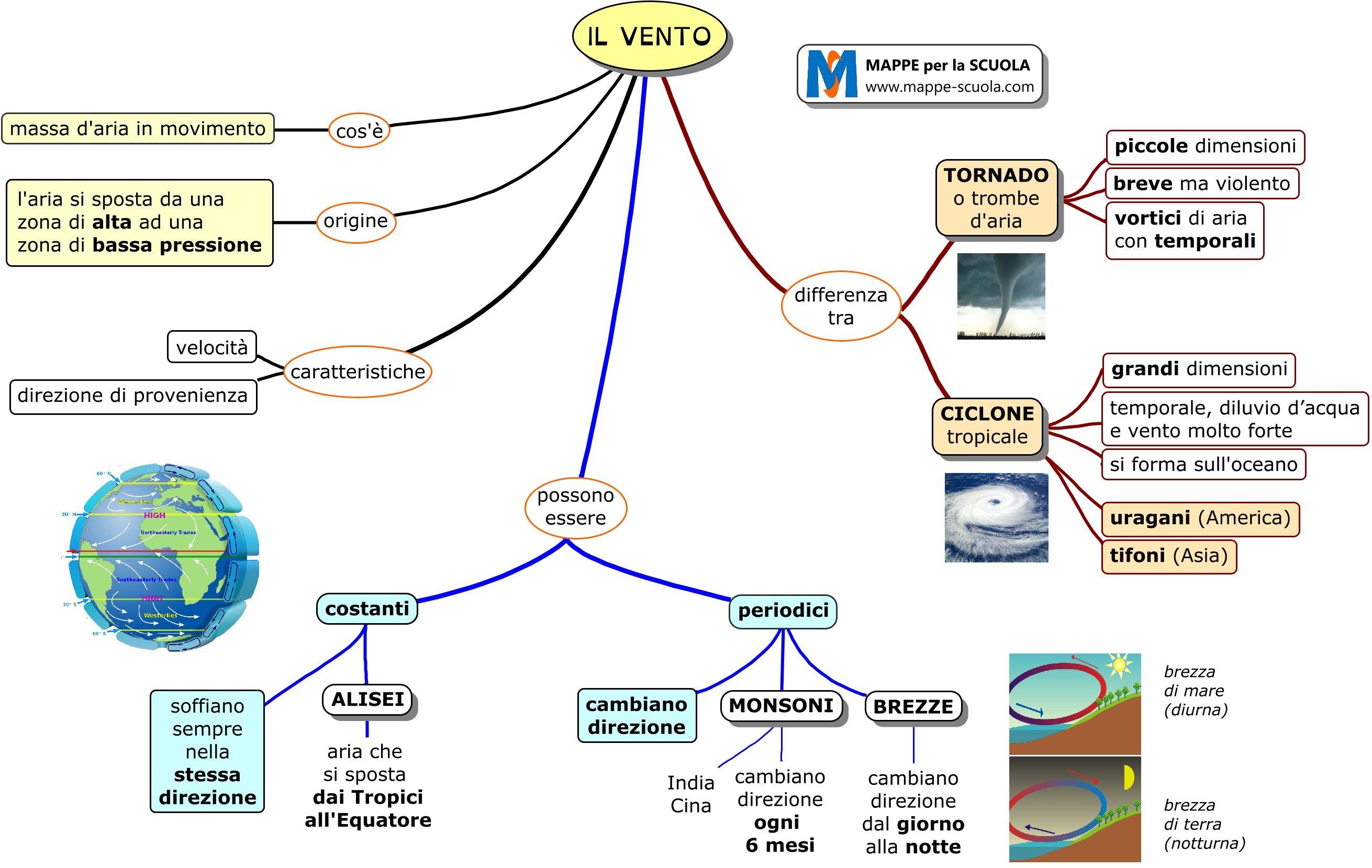 Cos'è il vento? Venti costanti (alisei) e venti periodici (monsoni, brezze); Differenza tra Tornado (tromba d'aria) e Ciclone (tifone; uragano).