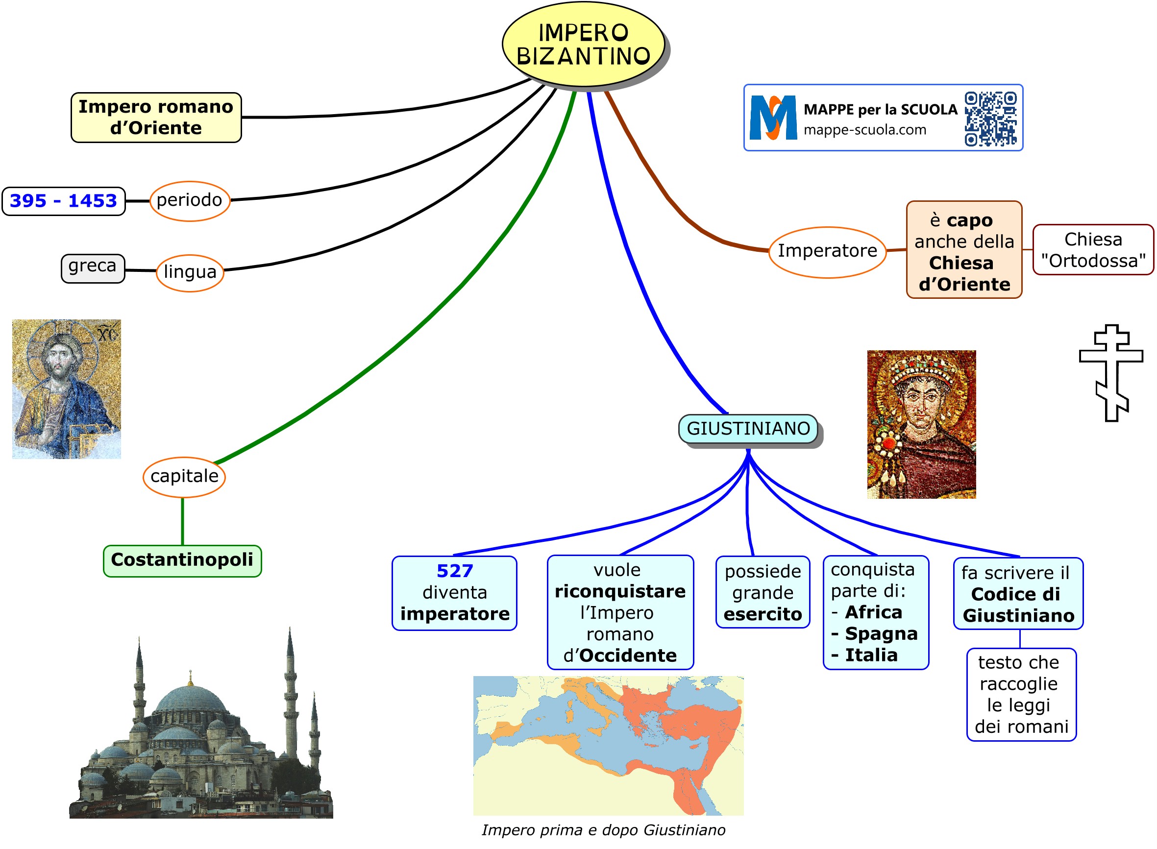 Mappa concettuale sull'Impero Bizantino e l'imperatore Giustiniano. L'Impero bizantino è l'Impero romano d'Oriente. La capitale dell'impero fu Costantinopoli. Giustiniano fu l'imperatore che conquistò parte dell'Impero romano d'Occidente...