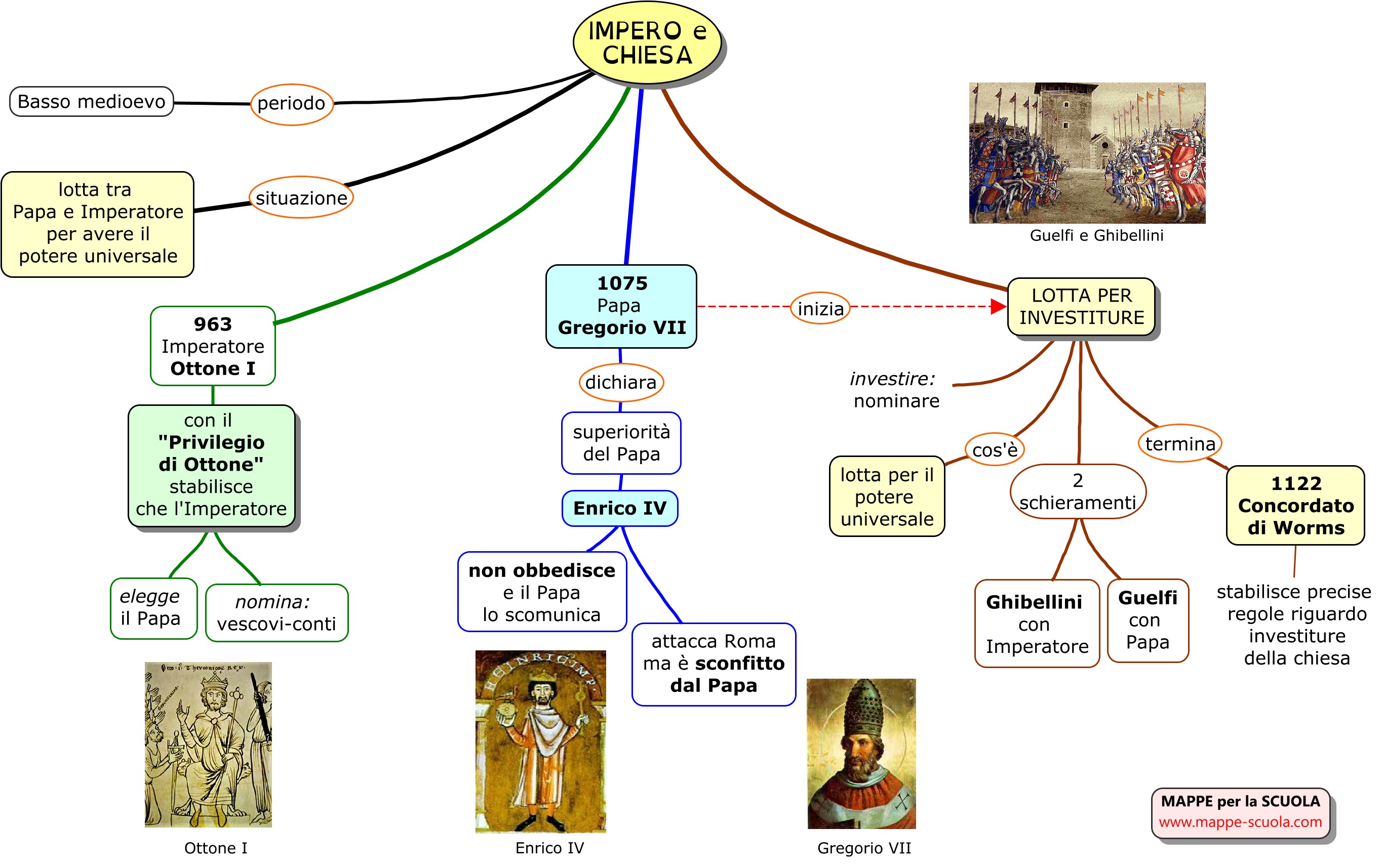 Mappa concettuale sulla LOTTA PER L'INVESTITURA tra l'Impero e la Chiesa.