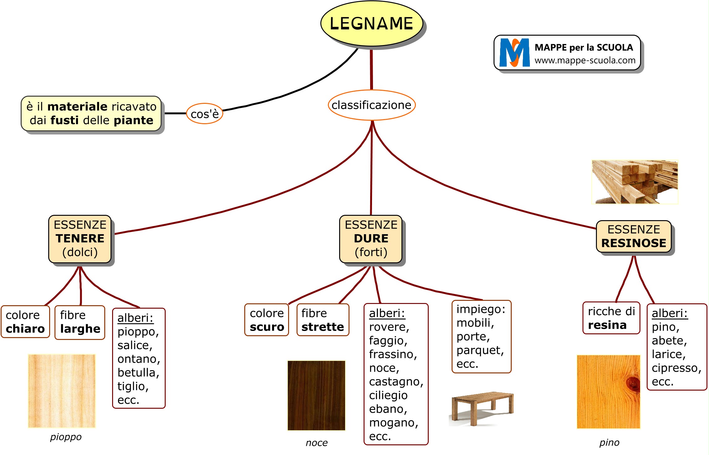 Il legname è il materiale ricavato dal fusto delle piante. Nello schema qui sotto la classificazione del legname: duro (forte), tenero (dolce) e fibroso.