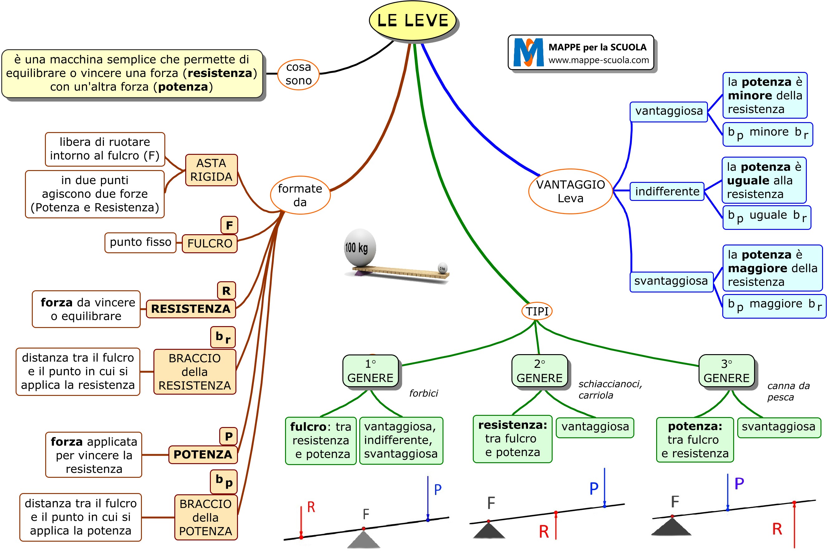 Mappa concettuale sulle LEVE (scienze, fisica). Questa mappa concettuale illustra il funzionamento e la classificazione delle leve.