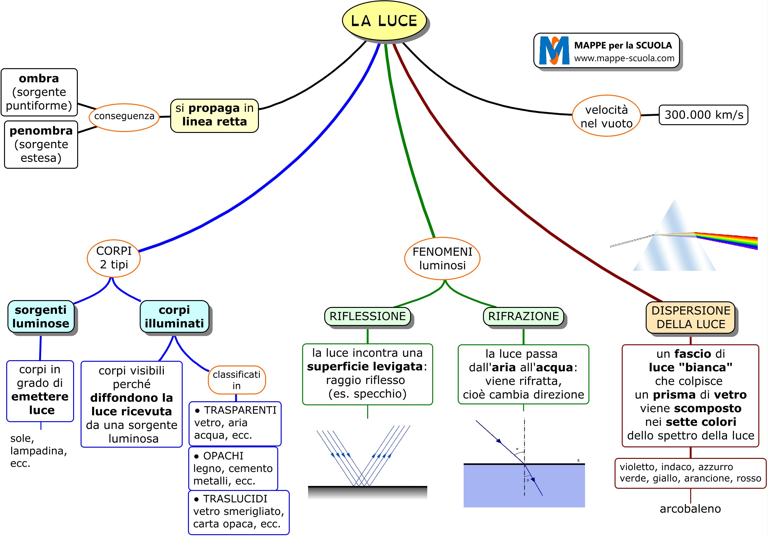 Nello schema qui sotto la luce e i fenomeni luminosi, la riflessione e la rifrazione, la dispersione della luce, ecc.