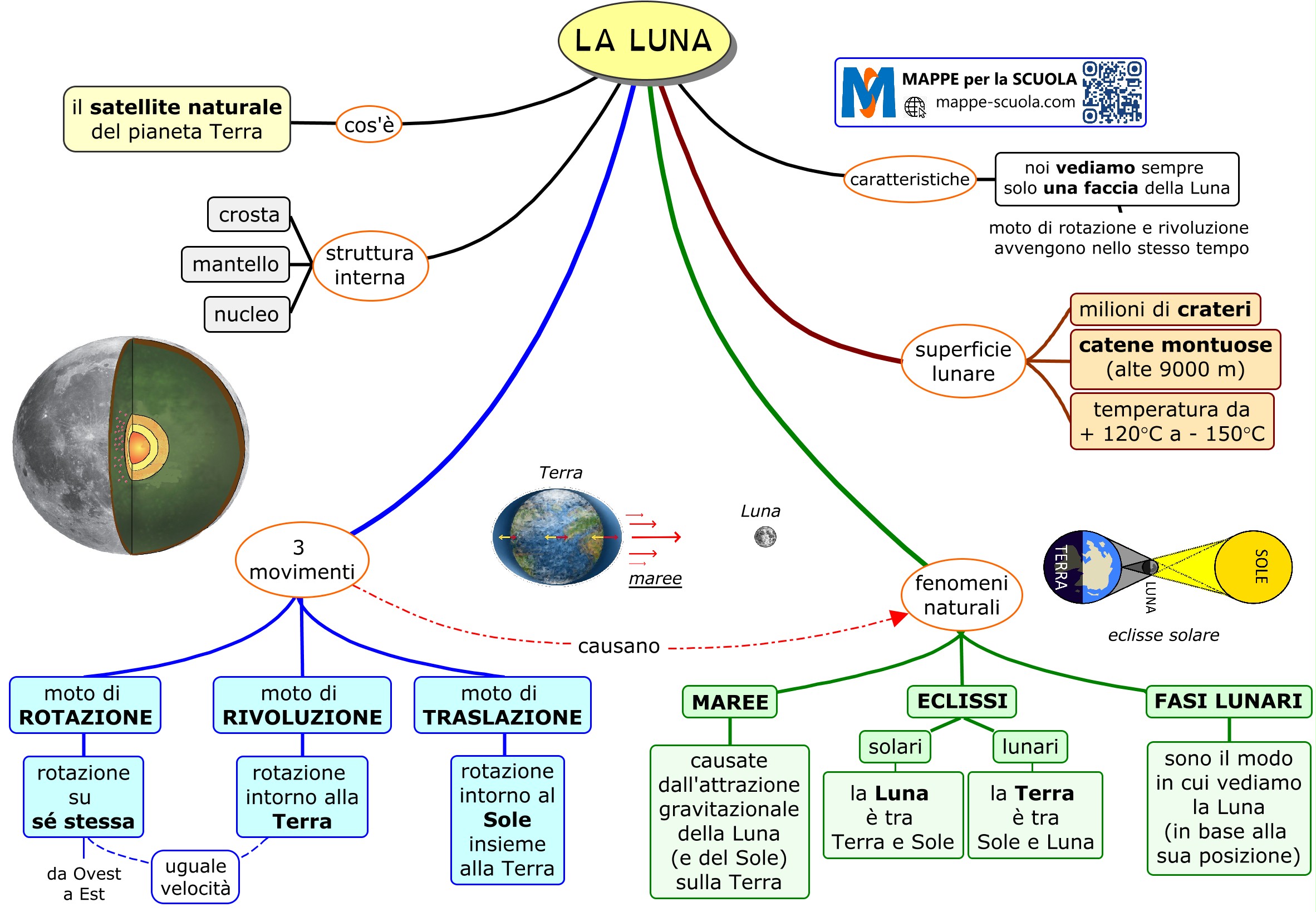Mappa concettuale sul satellite LUNA (scienze, scuola secondaria). La Luna è il satellite del pianeta Terra. Nella mappa viene descritta la Luna, i moti di rotazione, rivoluzione e traslazione; le fasi lunari, ecc.