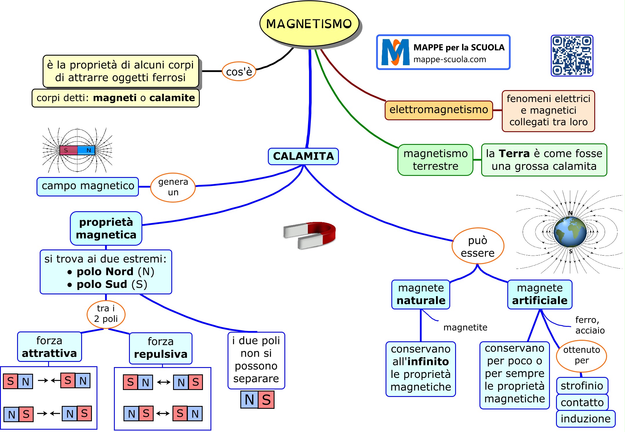 Mappa concettuale sul magnetismo (scienze). Il magnetismo è la proprietà di alcuni corpi, chiamati magneti, di attrarre oggetti ferrosi. Ogni magnete possiede due poli, Nord e Sud, che non possono essere separati e tra i quali si manifestano forze attrattive o repulsive. Il campo magnetico è lo spazio in cui agisce la forza di un magnete. Esistono magneti naturali, come la magnetite, e magneti artificiali ottenuti per strofinio, contatto o induzione. La Terra stessa si comporta come una grande calamita, generando il fenomeno del magnetismo terrestre.