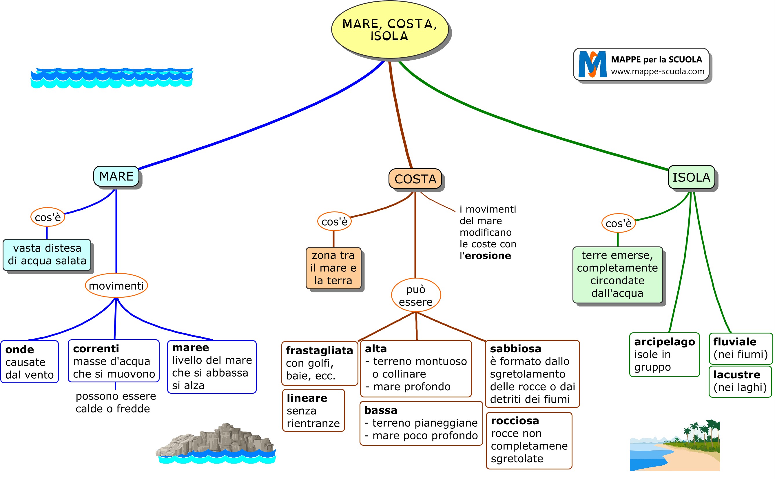 Nello schema qui sotto il mare (cos'è; onde, correnti e maree); la costa (frastagliata o lineare, alta o bassa, sabbiosa o rocciosa); l'isola (arcipelago, isola lacustre o fluviale).