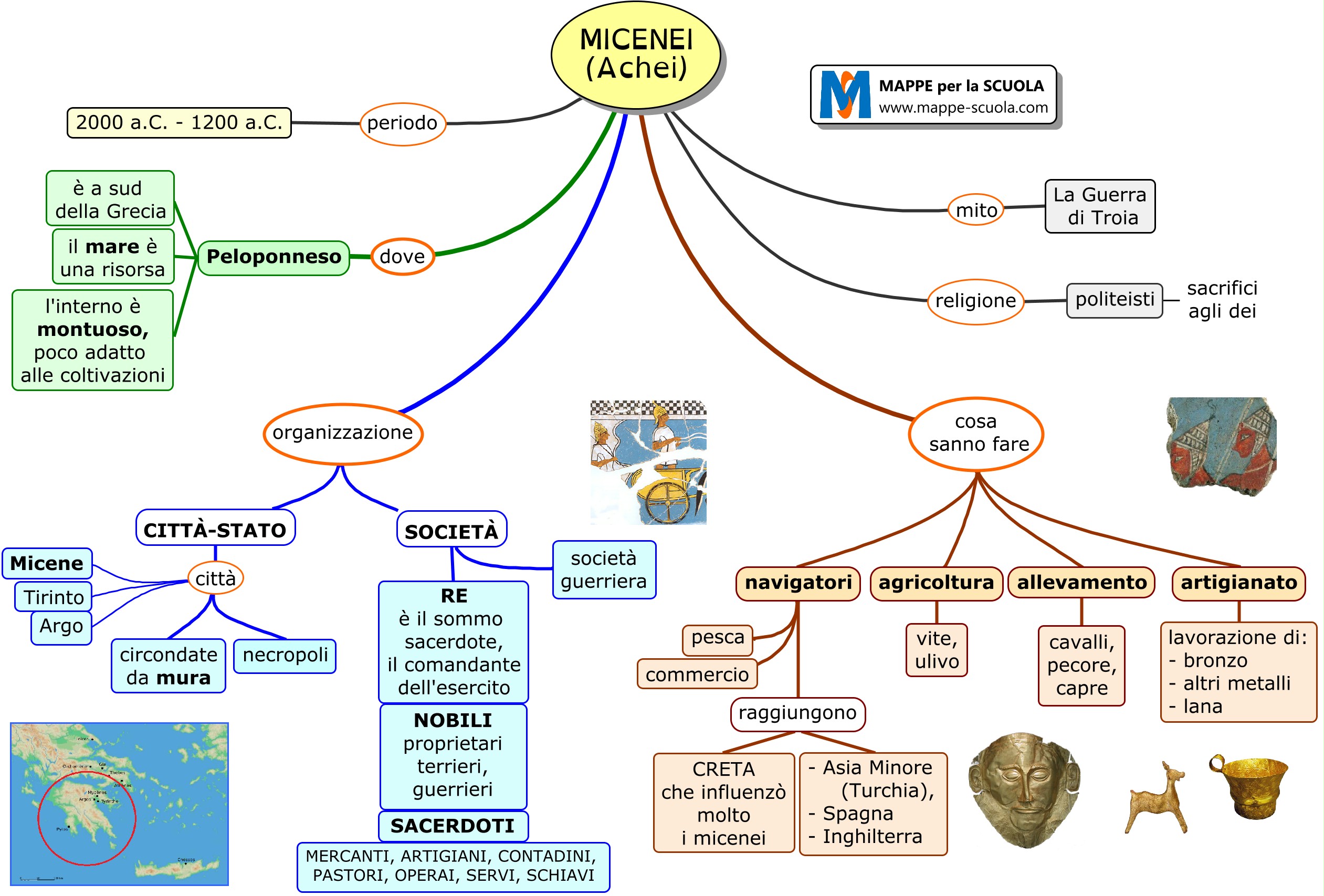 Mappa concettuale sulla civiltà MICENEA (ACHEI). I Micenei abitarono nel territorio del Peloponneso. Micene, la navigazione e i contatti con Creta, il mito della Guerra di Troia...