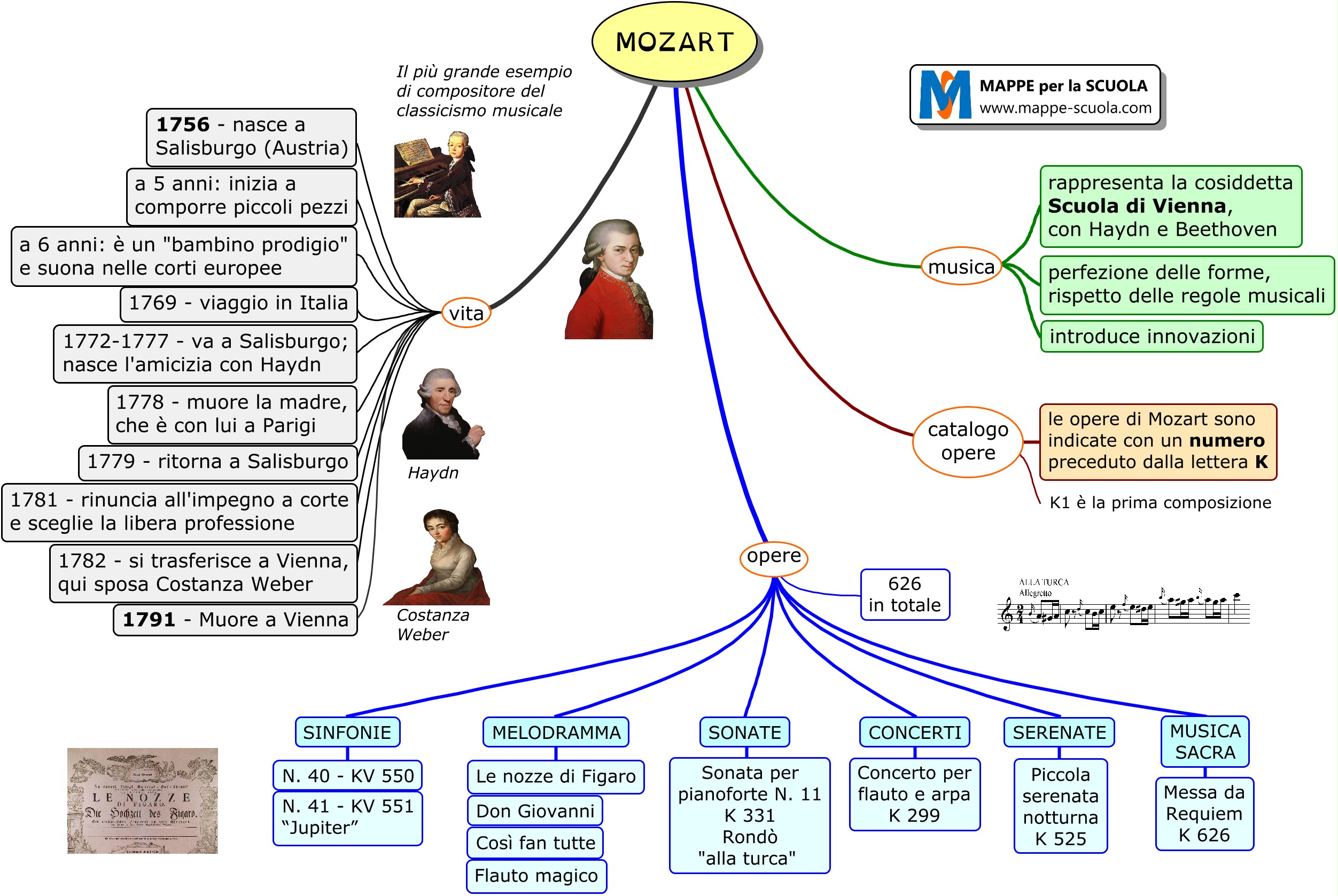 Mappa concettuale su Mozart (musica, scuola secondaria). Wolfgang Amadeus Mozart è considerato il maggiore compositore del classicismo musicale. Nello schema qui sotto, la vita e il genere di composizioni di Mozart (sinfonie, serenate, melodramma, concerti, musica sacra, ecc).