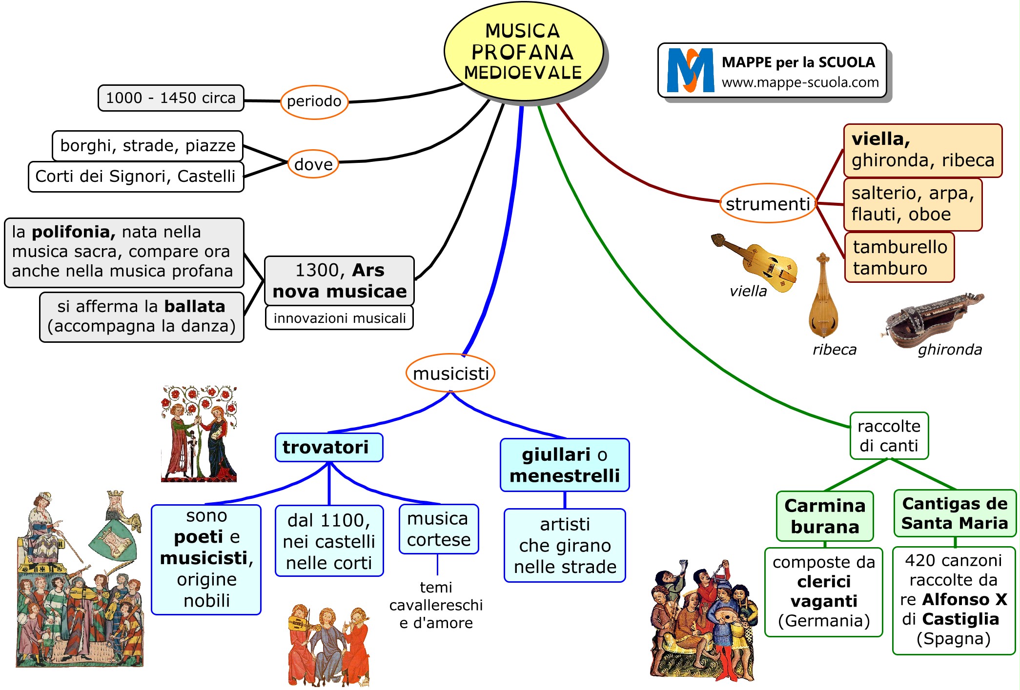 Mappa concettuale sulla musica profana medioevale. Nello schema qui sotto, caratteristiche della musica profana del medioevo, i trovatori e i menestrelli, le raccolte Carmina burana e Cantigas de Santa Maria, introduzione della polifonia, gli strumenti musicali: viella, ghironda, ribecca e altri.