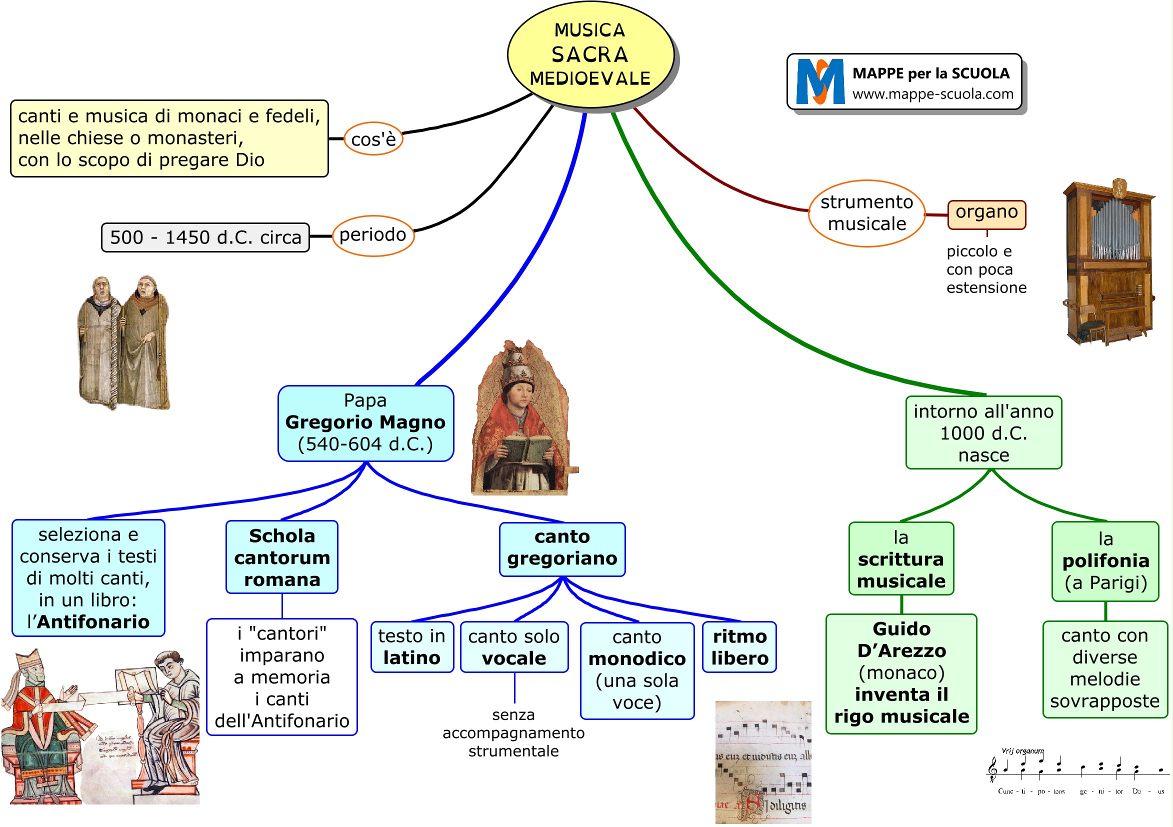 Mappa concettuale sulla musica sacra medioevale. Nello schema qui sotto, caratteristiche della musica sacra del medioevo, papa Gregorio Magno (i canti gregoriani e la Schola cantorum romana), Guido d’Arezzo e la prima scrittura musicale, la nascita della polifonia, l’organo (unico strumento permesso),