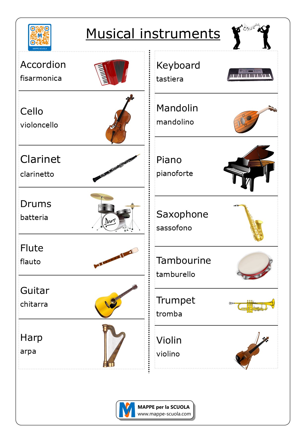 Scheda sugli strumenti musicali (musical instruments) con i temini in inglese, traduzione e un'immagine. Qui sotto la scheda da stampare o visualizzare degli strumenti musicali.