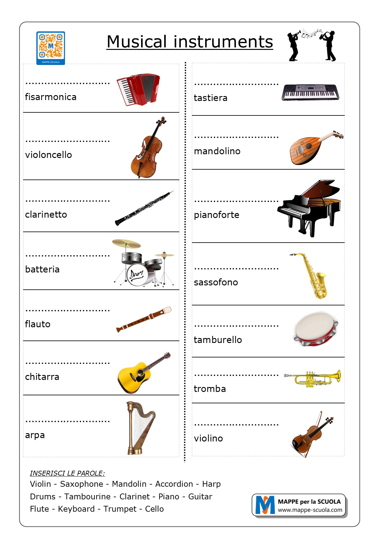 Qui la scheda MUSICAL INSTRUMENTS con i termini in inglese e la traduzione.