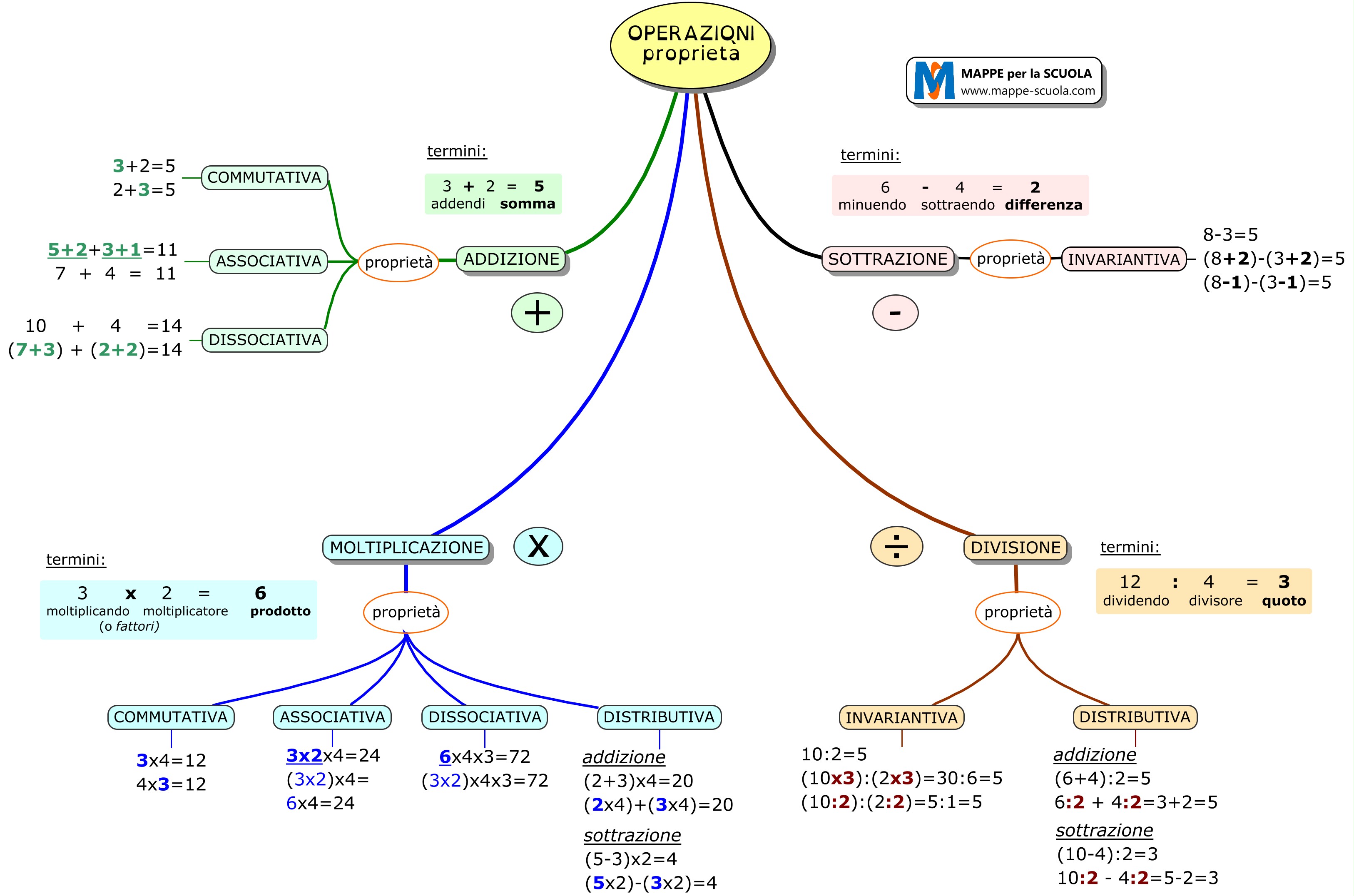 Mappa concettuale sulle PROPRIETÀ delle 4 operazioni (matematica, Scuola secondaria). Le proprietà delle quattro operazioni: commutativa, associativa, dissociativa...