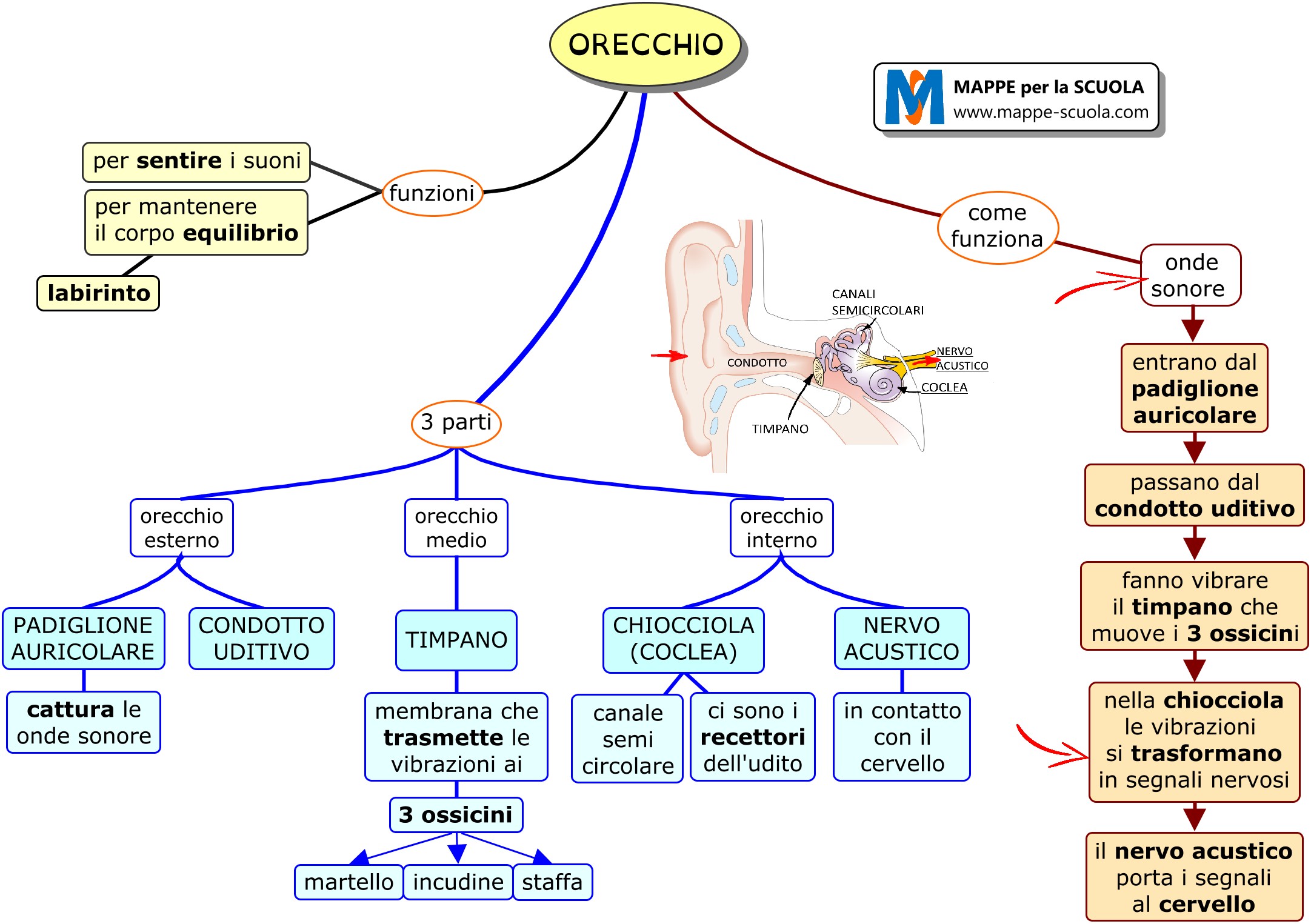 Mappa concettuale sull'ORECCHIO, l'organo dell'udito.