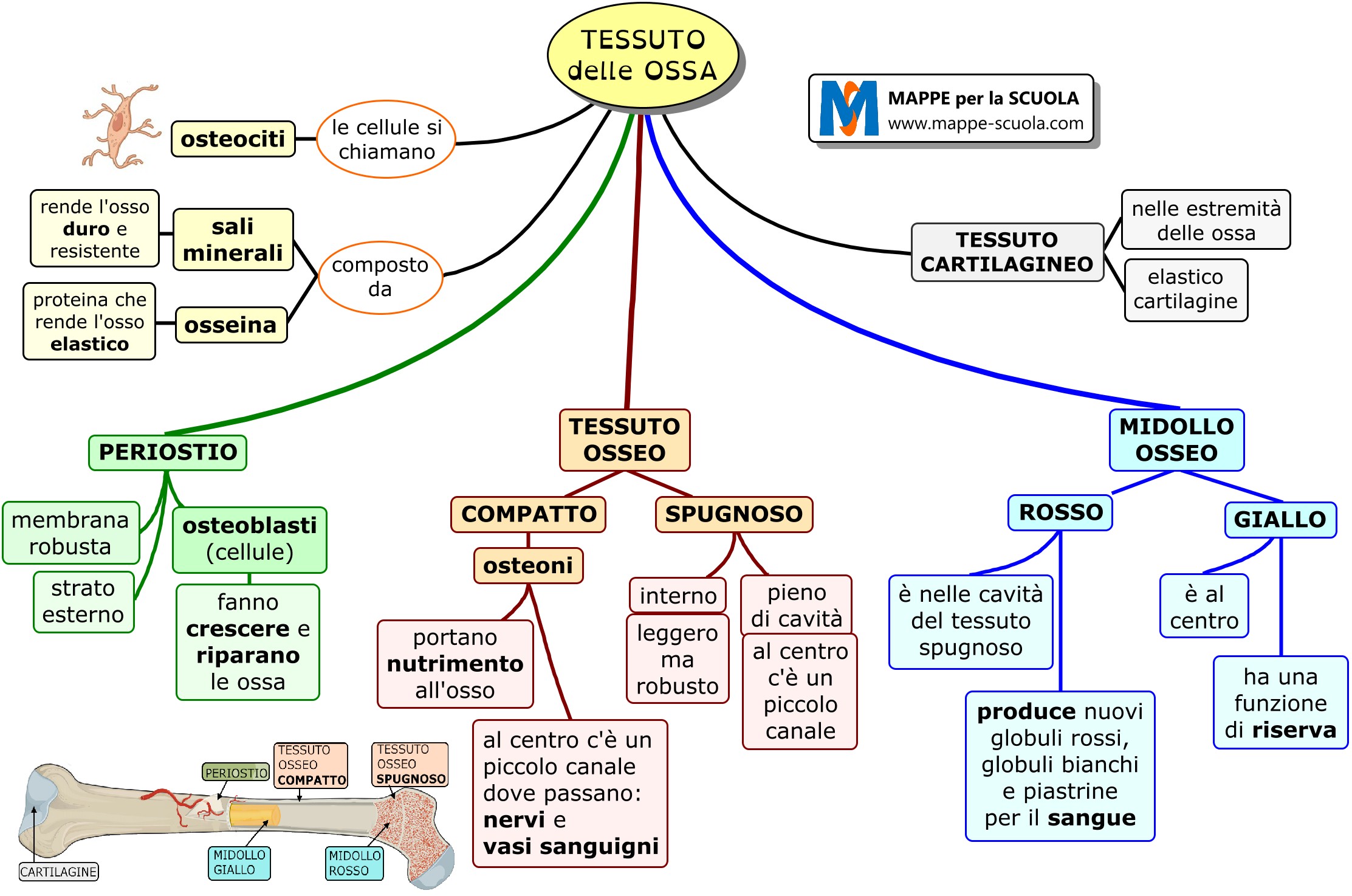 Mappa concettuale sulle ossa e il tessuto osseo (il corpo umano, scuola secondaria). Nello schema è descritto il periostio, il tessuto osseo compatto e il tessuto osseo spugnoso, il midollo osseo rosso e il midollo osseo giallo, il tessuto cartilagineo.