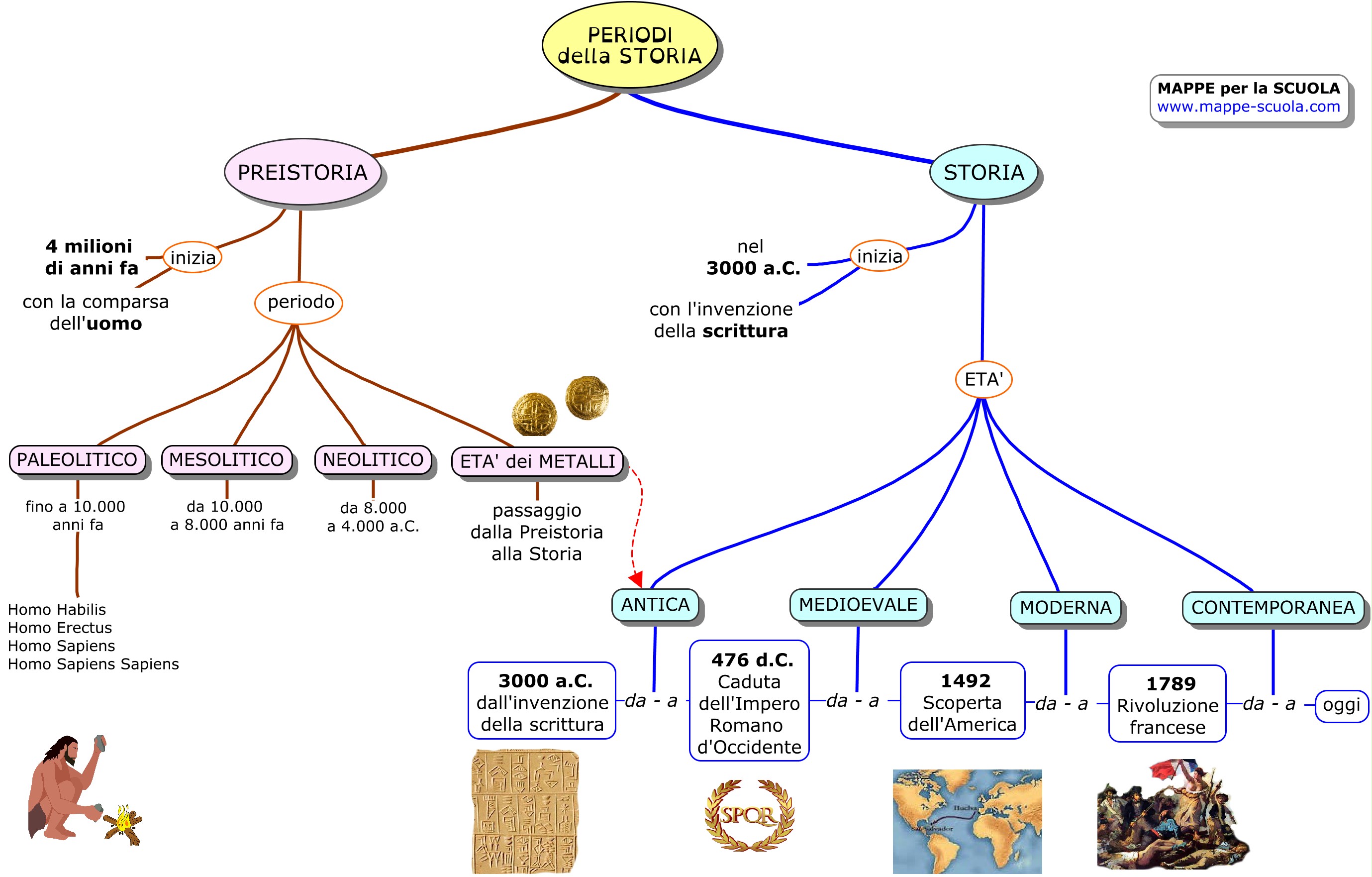 Schema sulla STORIA: I PERIODI.LA PREISTORIA: (paleolitico, mesolitico, neoliticoe età dei metalli);LA STORIA: antica, medioevale (Alto Medioevo e Basso Medioevo), moderna e contemporanea.