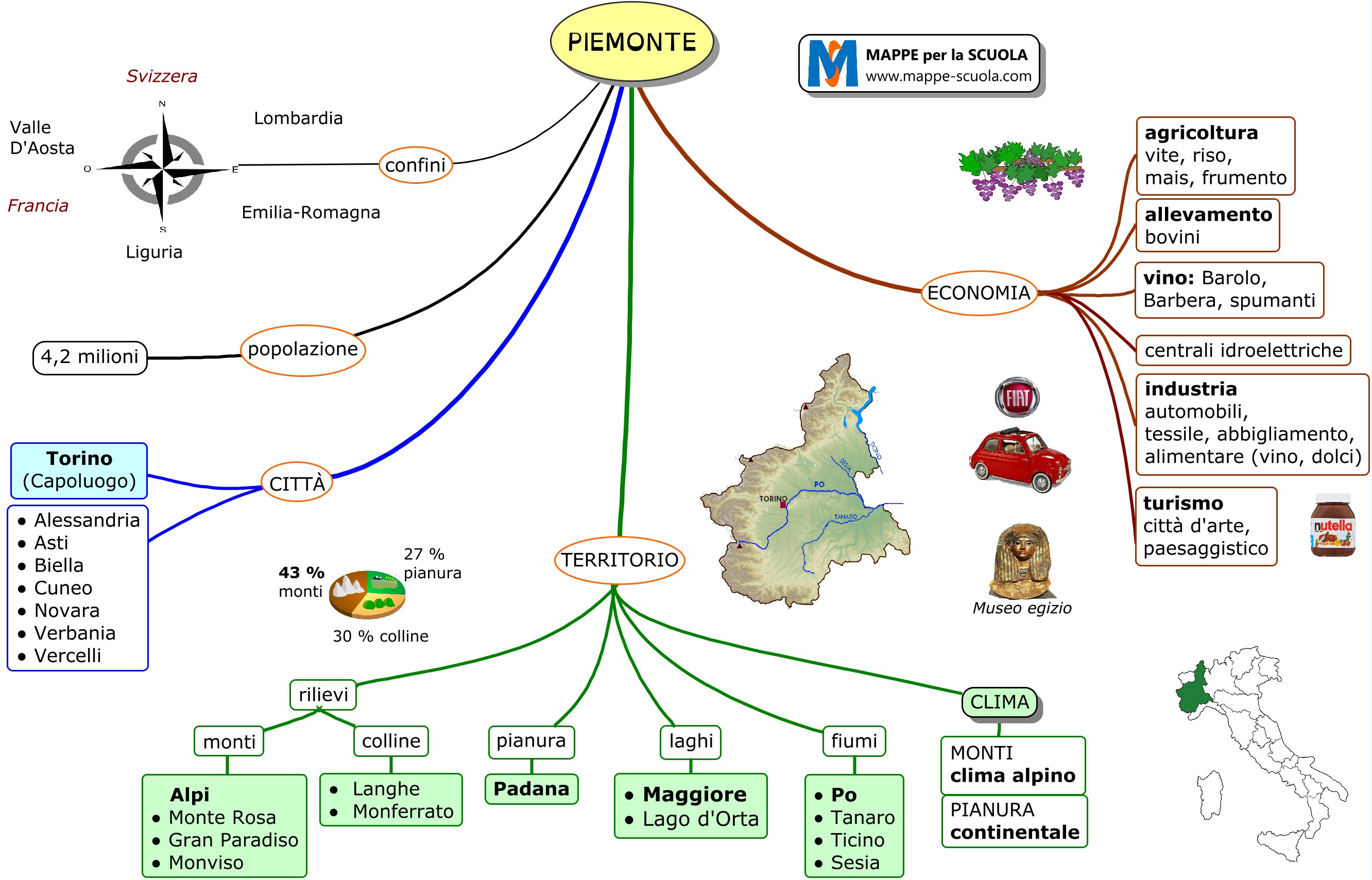 Mappa concettuale sulla Regione PIEMONTE (geografia, scuola primaria).