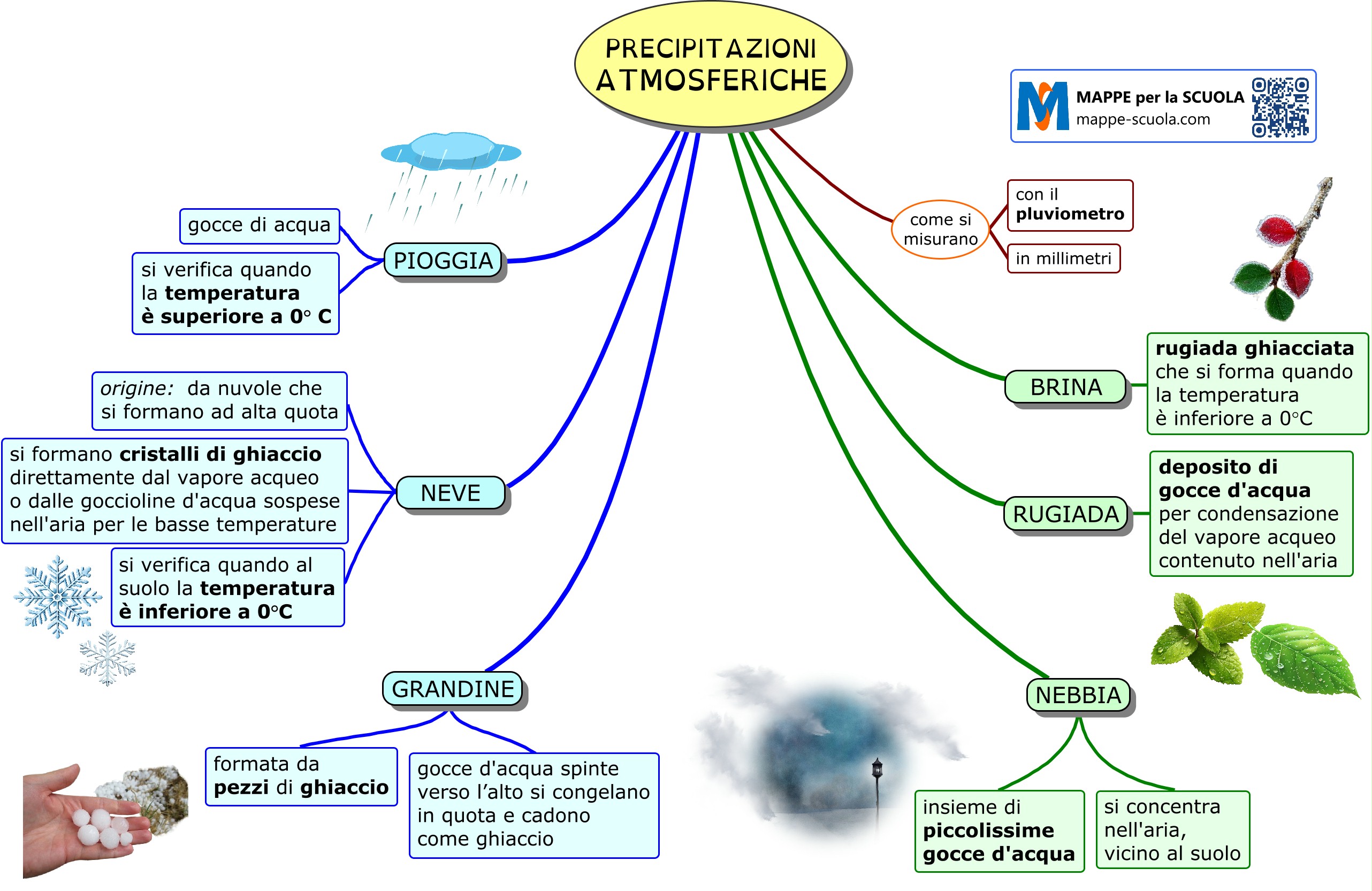 Mappa concettuale sulle PRECIPITAZIONI ATMOSFERICHE: pioggia, neve, grandine, nebbia, rugiada e brina. Le precipitazioni atmosferiche rientrano nel Ciclo dell'acqua...