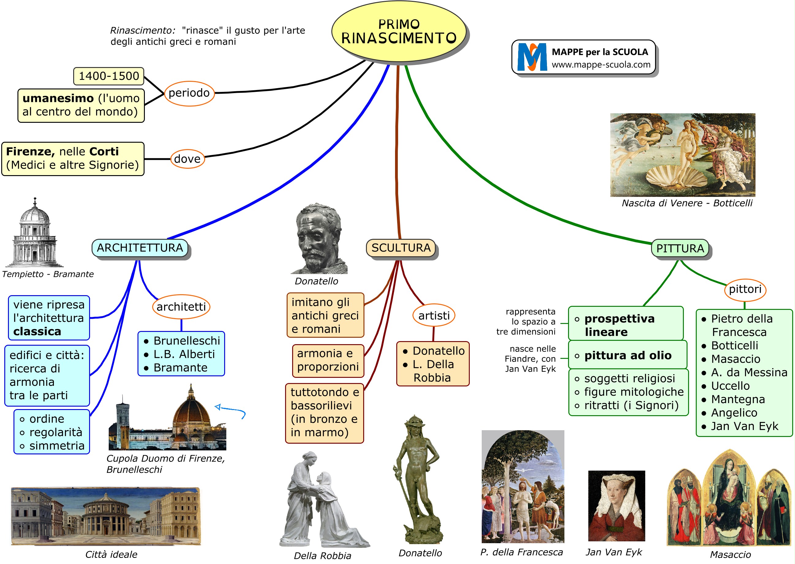 Mappa concettuale sul Primo Rinascimento nell'arte (Arte e Immagine - Scuola secondaria). Il Rinascimento nasce e si sviluppa a Firenze nel 1400. Nello schema qui sotto le caratteristiche e i personaggi principali dell'architettura, della scultura e della pittura del Primo Rinascimento.