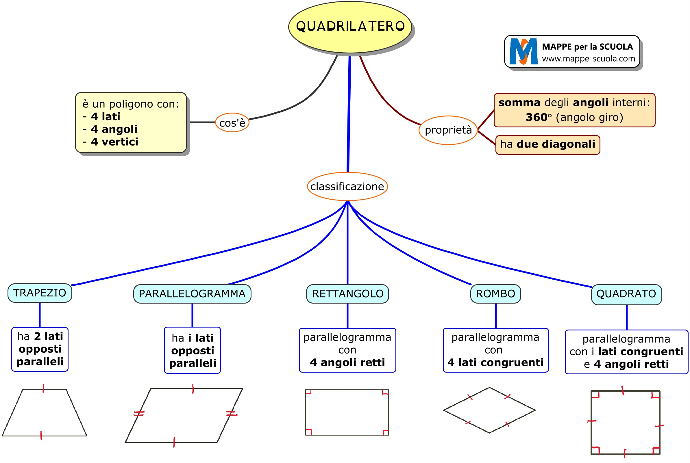 Mappa concettuale sui QUADRILATERI (geometria).Il quadrilatero è un poligono con quattro lati e quattro angoli.Sono dei quadrilateri: trapezio, parallelogrammo, rettangolo, rombo e quadrato.