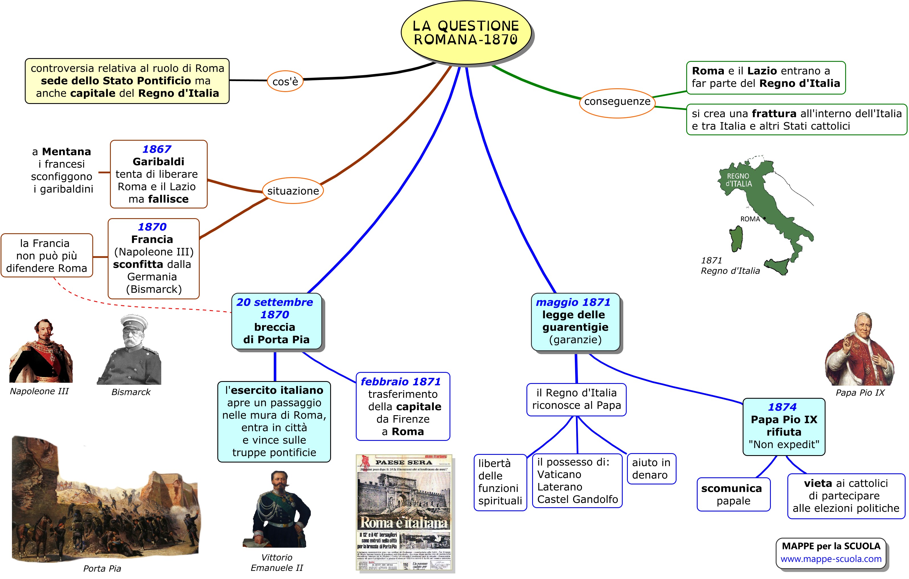Dopo la Terza guerra d'indipendenza italiana, Roma e il Lazio appartengono ancora allo Stato pontificio. La Francia viene sconfitta dalla Germania e non può più proteggere il Papa. Il 20 settembre 1870, l'esercito italiano riesce ad entrare a Roma, (breccia di Porta Pia).