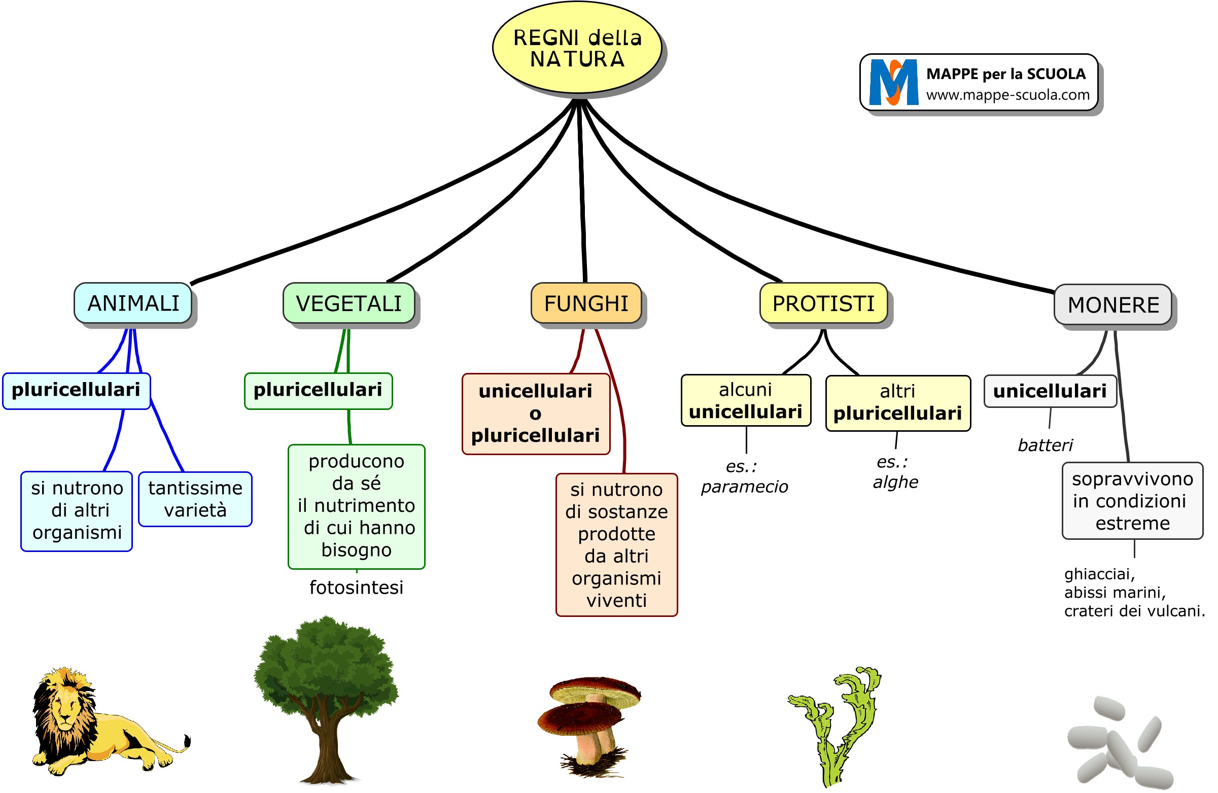 Mappa concettuale sui REGNI DELLA NATURA (scienze, scuola). Nello schema sottostante i cinque regni della natura: Animali, Vegetali (piante), Funghi, Protisti e Monere.